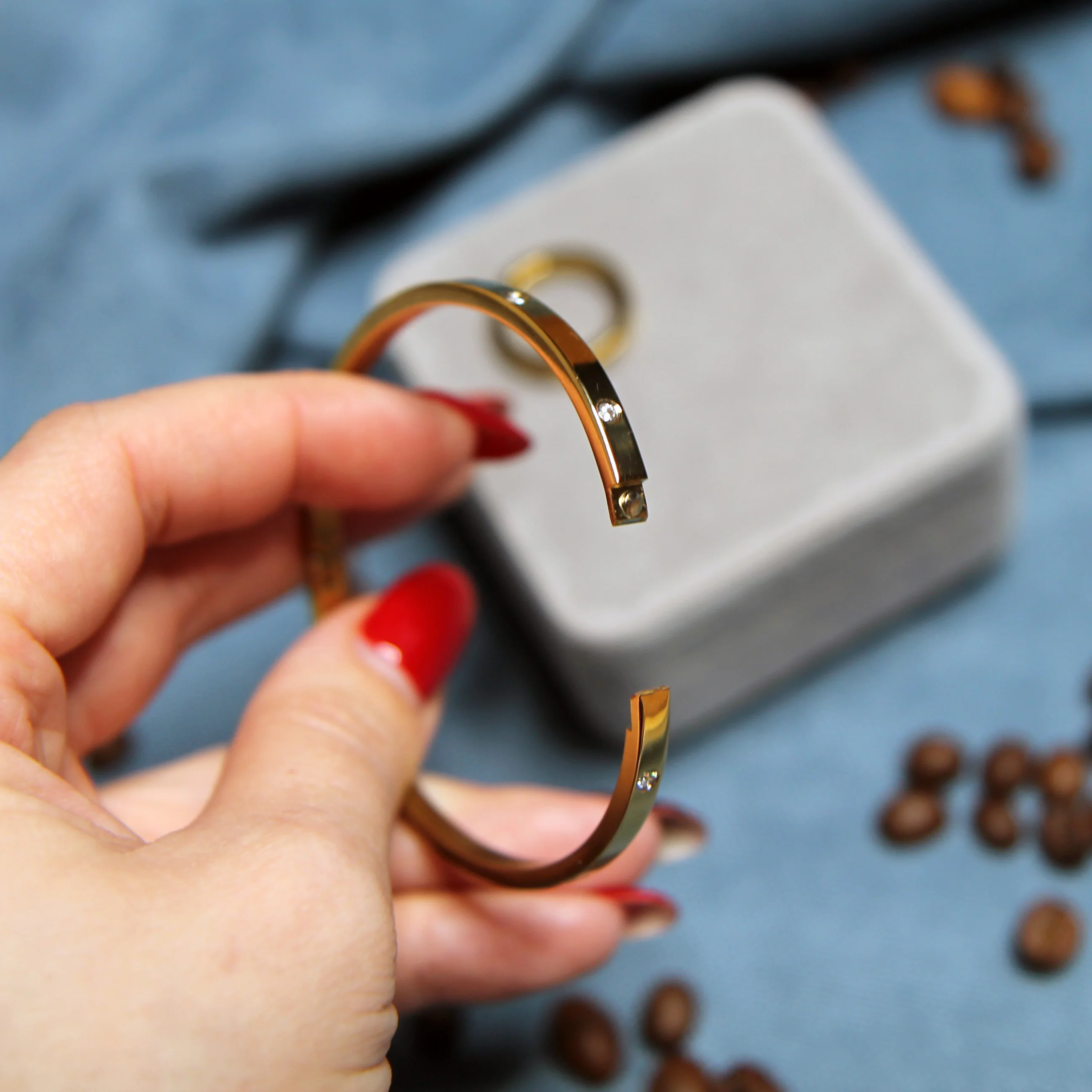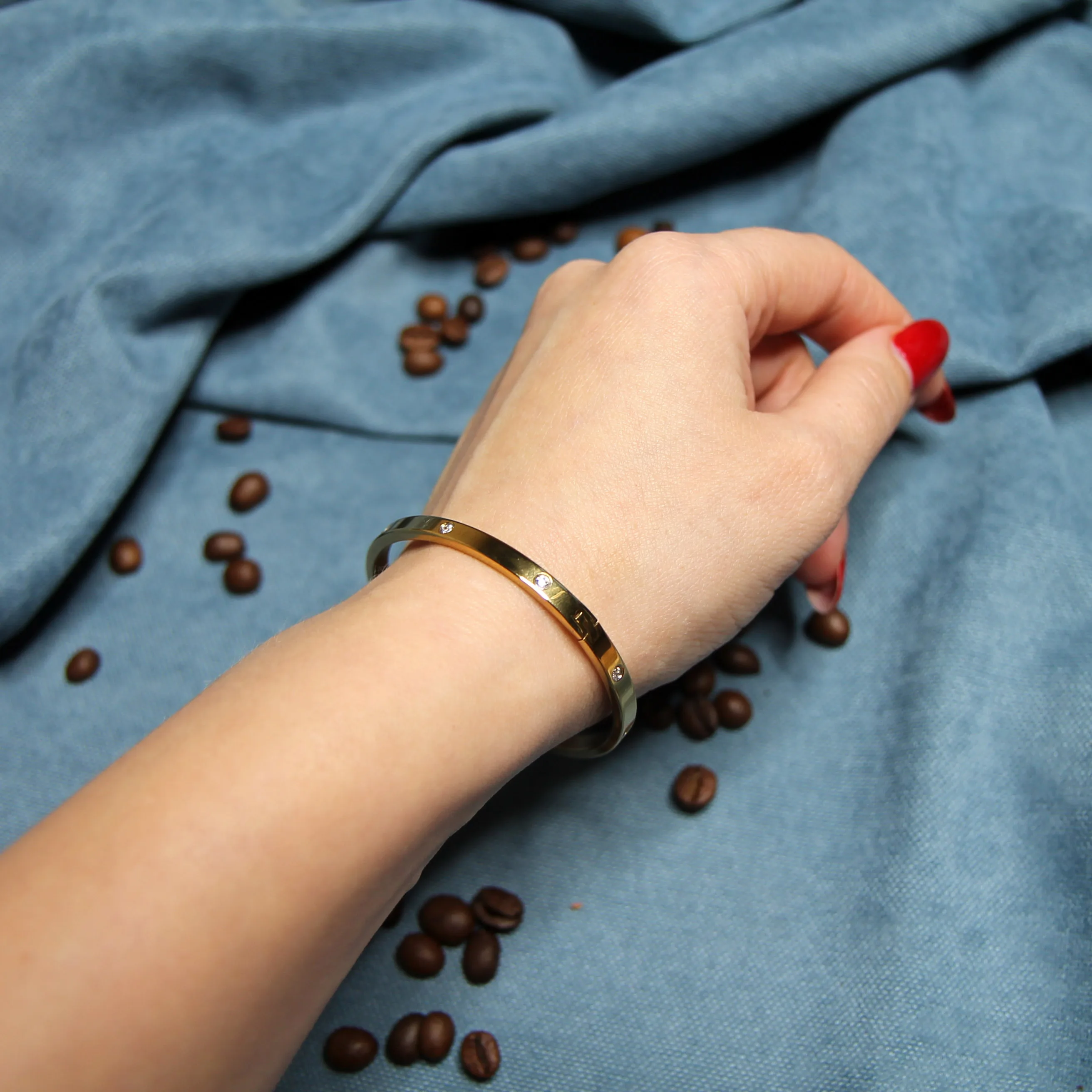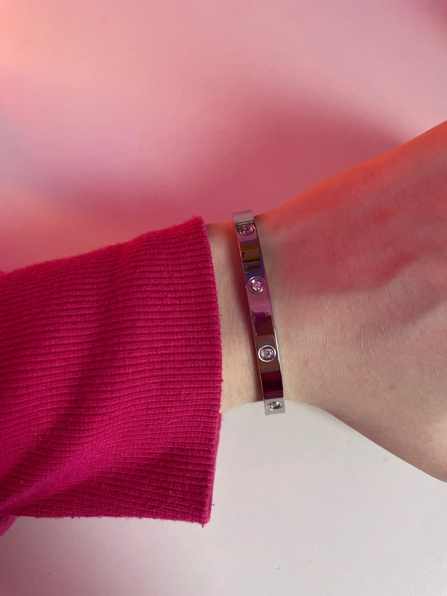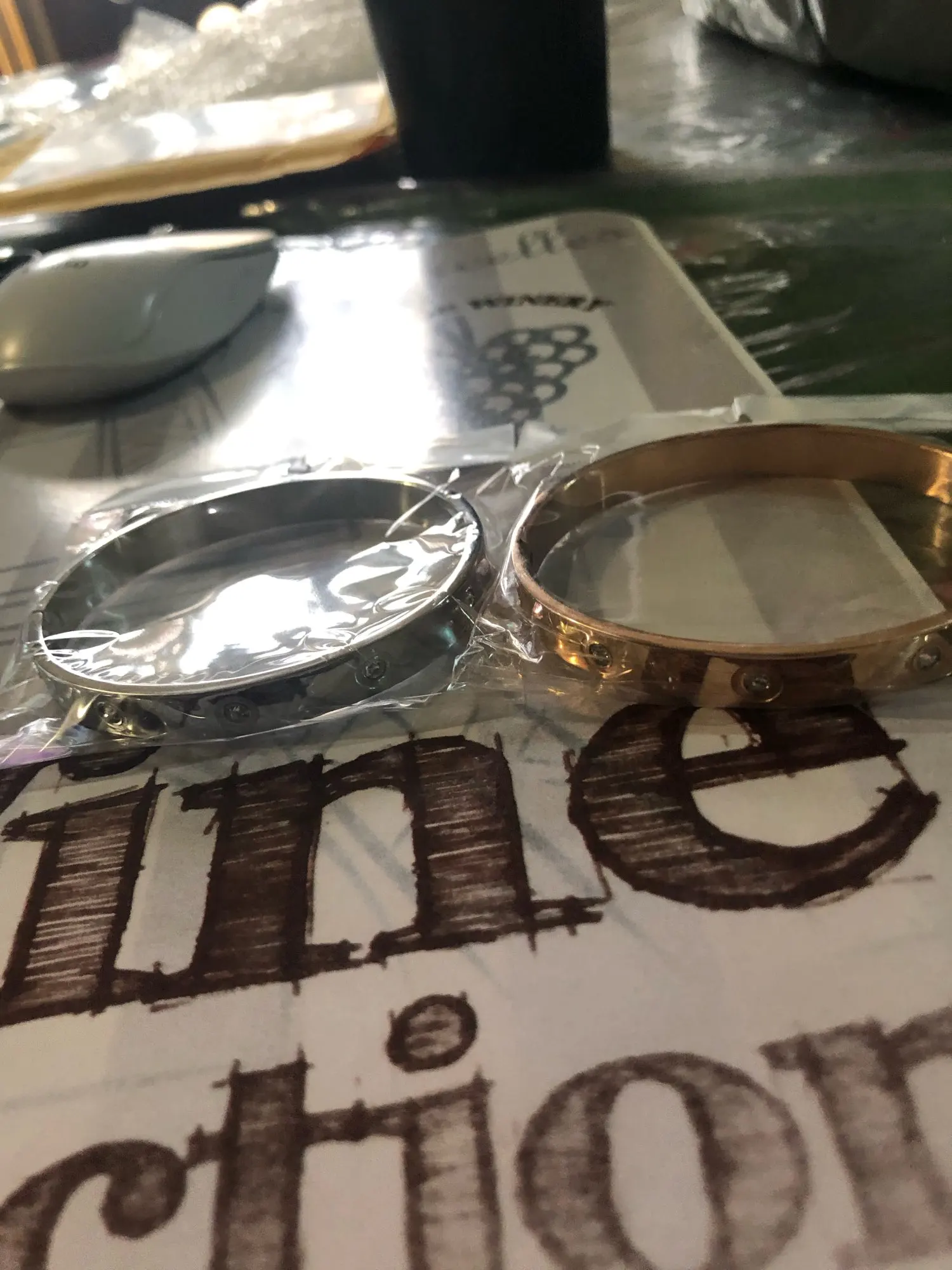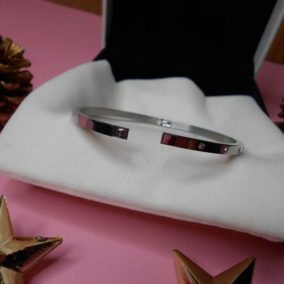 Шикарный браслет в стиле известного бренда.Доставка товара в пределах трех недель,с треком отслеживания до нашего почтового отделения. У продавца по ссылке браслеты трёх цветов : золотой,цвета серебра и цвета розового золота.Я выбрала серебро.Металл - нержавеющая сталь.Растегивается и застёгивается при помощи простейшего механизма.Все камешки на месте.На ручке сидит шикарно,стильное и оригинальное украшение. Браслетик супер !Ношу с удовольствием!