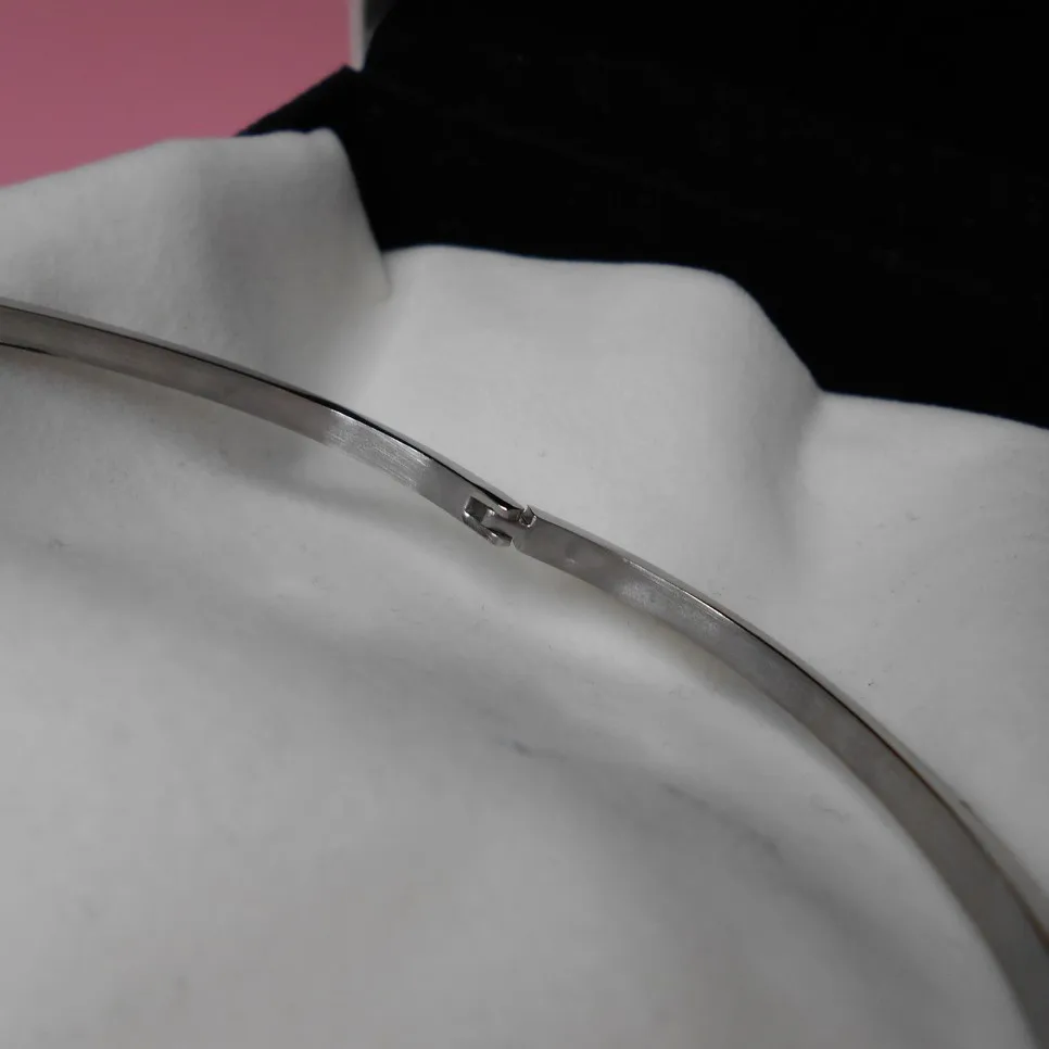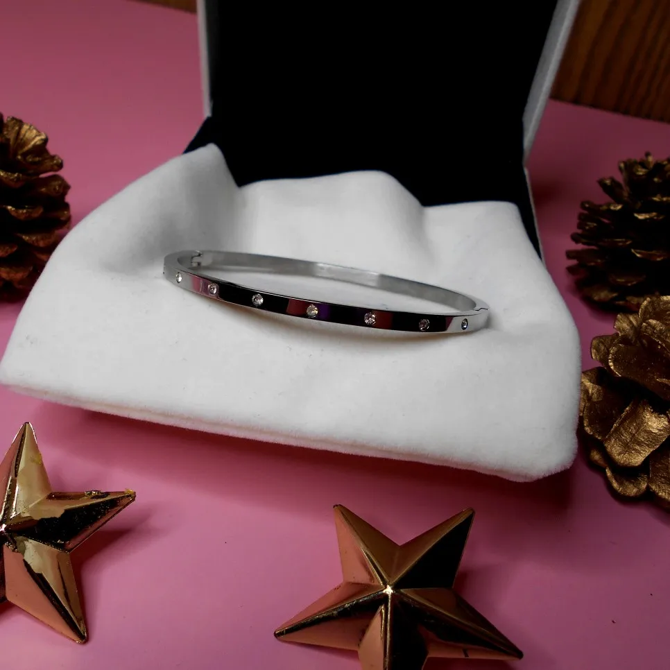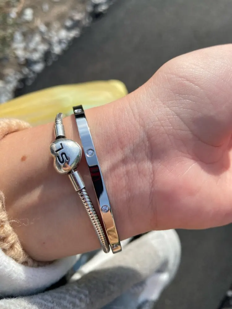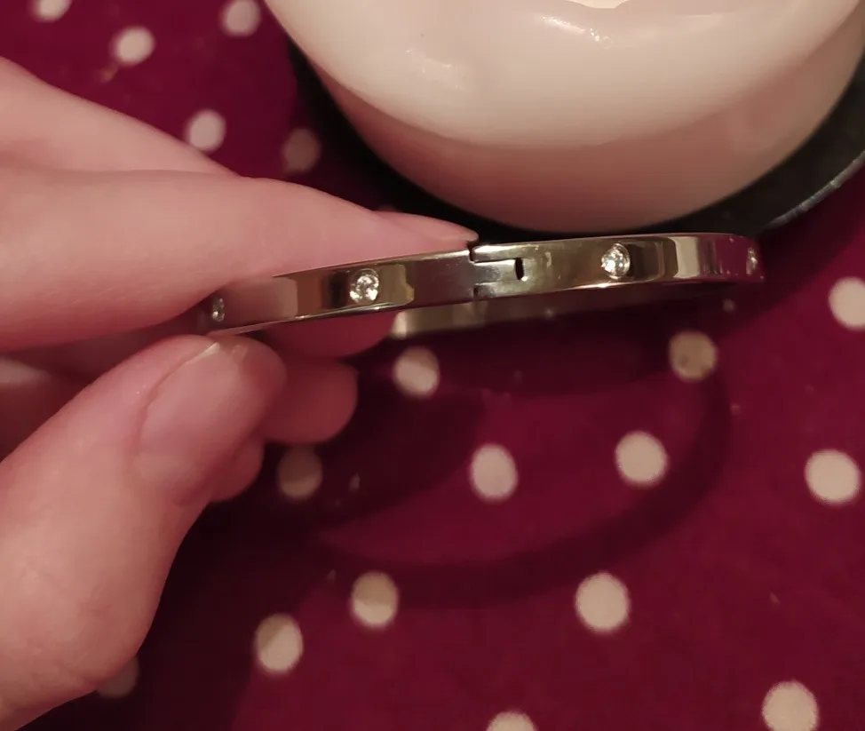 Браслет в серебристом цвете, очень похоже на серебро, но сплав нержавеющая сталь. Делится на две части. С одной стороны части соединяются дужкой. С другой замочком. Замочек легко расстегивается, нужно только немного надавить на одну из частей браслета. При этом самостоятельно он не расстегнется. На передней части браслета есть маленькие, аккуратненькие алмазики. На задней части их нет. Браслет тоненький, 16 см обхват. Подойдет на тоненькую ручку. Он не круглый, а овальный - это огромный плюс, ложиться идеально по руке. Сплав нержавеющая сталь. Браслет мне понравился. Магазин и продавца советую. Товар шел 3 недели. Отслеживался на всем пути. Был упакован в пупырку и в коробку.