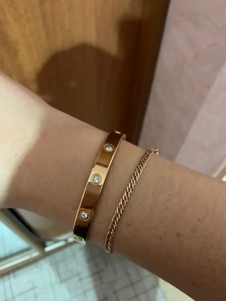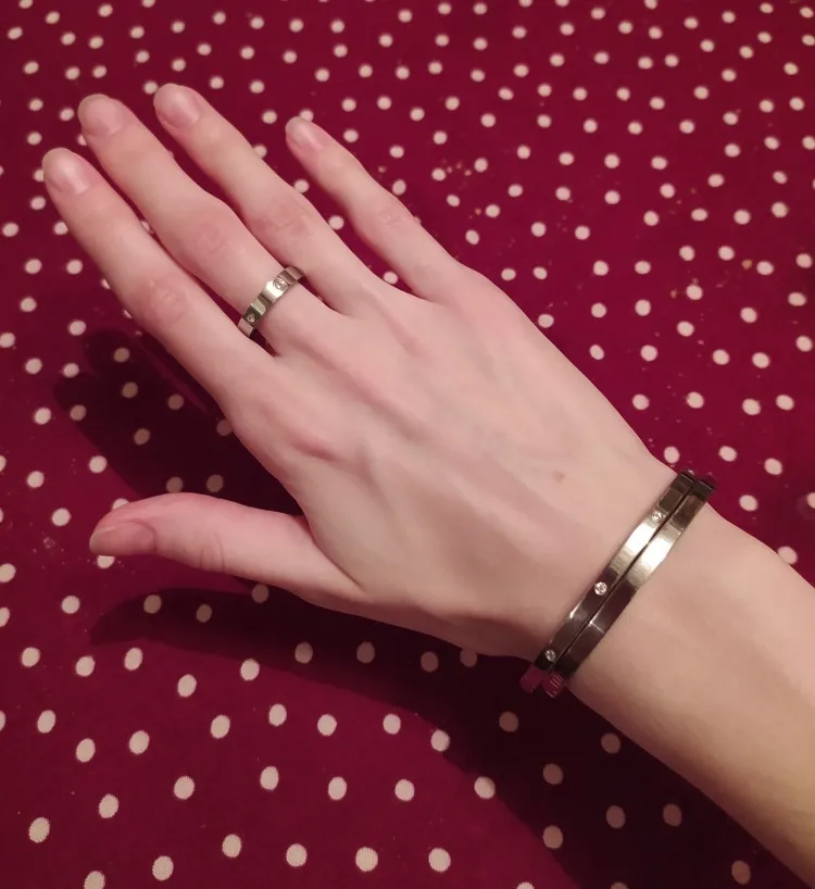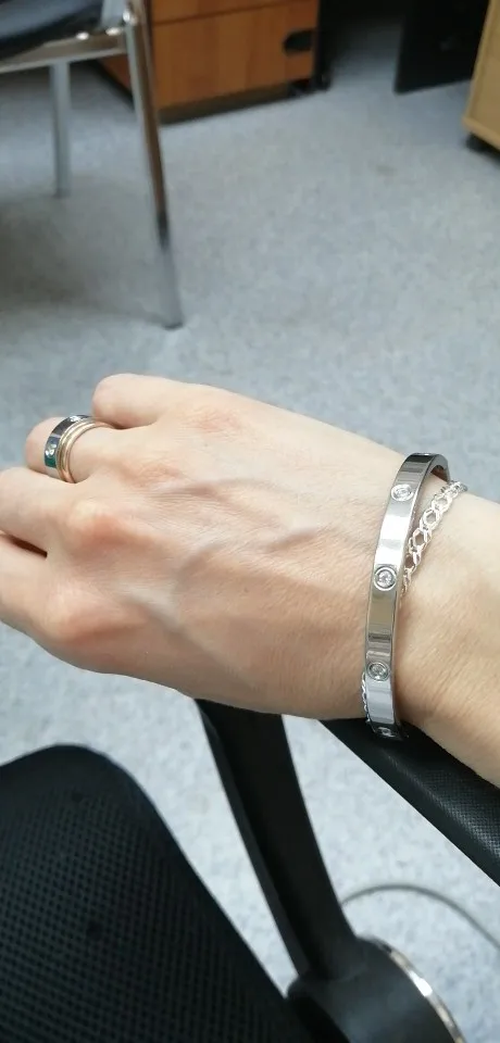 Браслет классный. Выполнен достойно. Сидит хорошо. Не выглядит дешёвкой. И не точь в точь картье что очень хорошо. Но! Я заказывала в цвете серебро, а продавец отправил золото. Но в любом случае мне понравился