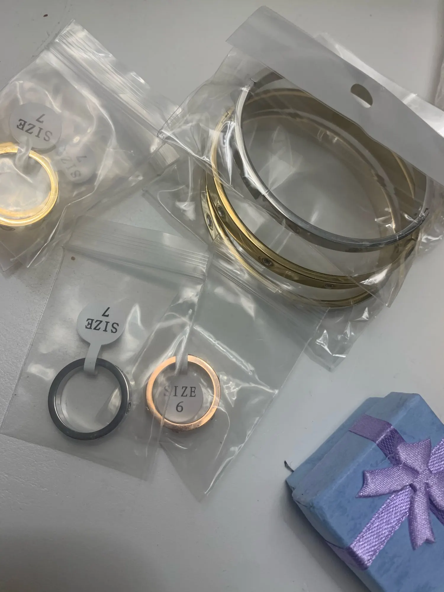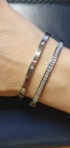На фото два браслета из нержавеющей стали от разных продавцов: с камнями от Fysara, отзывы на который вы сейчас и читаете, без камней от Fine4U, тоже с Али. У моего браслета с камнями застёжка до конца не сходится, что портит впечатление, это видно при носке. Несмотря на это, браслет крепко застёгивается и не расстёгивается сам. Все камни на месте, они поменьше, чем у аналогичного кольца этого же продавца, а потому смотрятся лучше и аккуратнее. Вокруг камней есть вырез/каёмка/борозда, как и на более широком браслете. Камни вклеены - на обратной стороне браслета нет посадочных дырочек под камни. Внимание, по браслету видно, что он не серебряный и не из белого золота: он темнее, и это видно невооружённым глазом! Заказ дошёл до СПб за две недели обычной почтой, успел к Новому году.