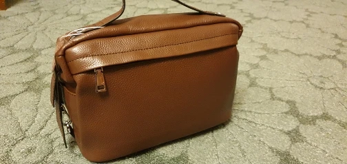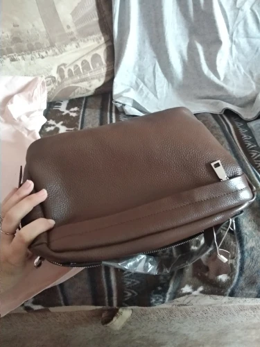 Very good quality bag. Looks and smells like real leather. Looks expensive. One disadvantage - one strap is short and cannot be used crossbody, only shoulder like at the picture.