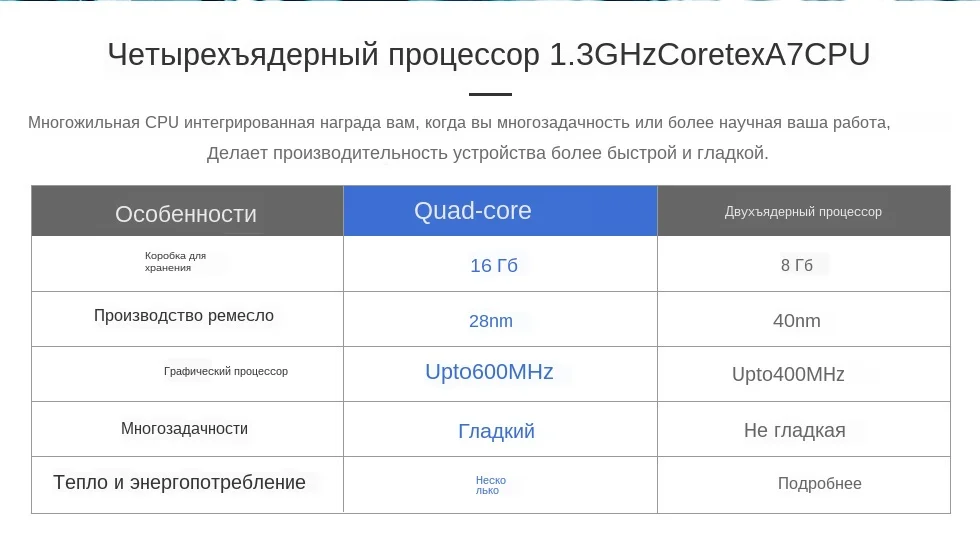 ЦП: высокое качествоЧетырехъядерный процессор MT8227L 1,3-1,5 ГГц Cortex-A7Процессор с отличной производительностью