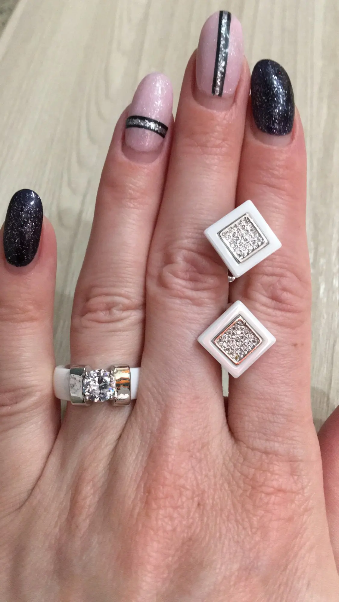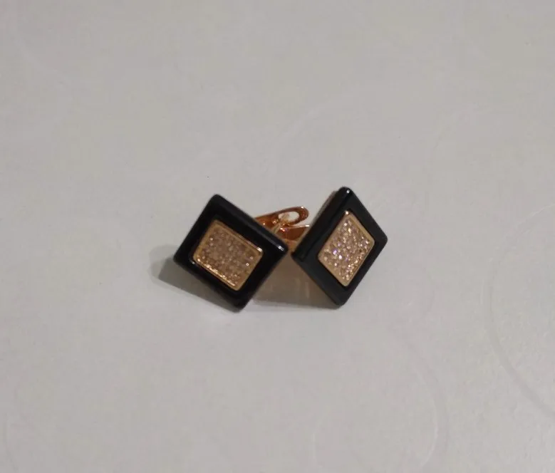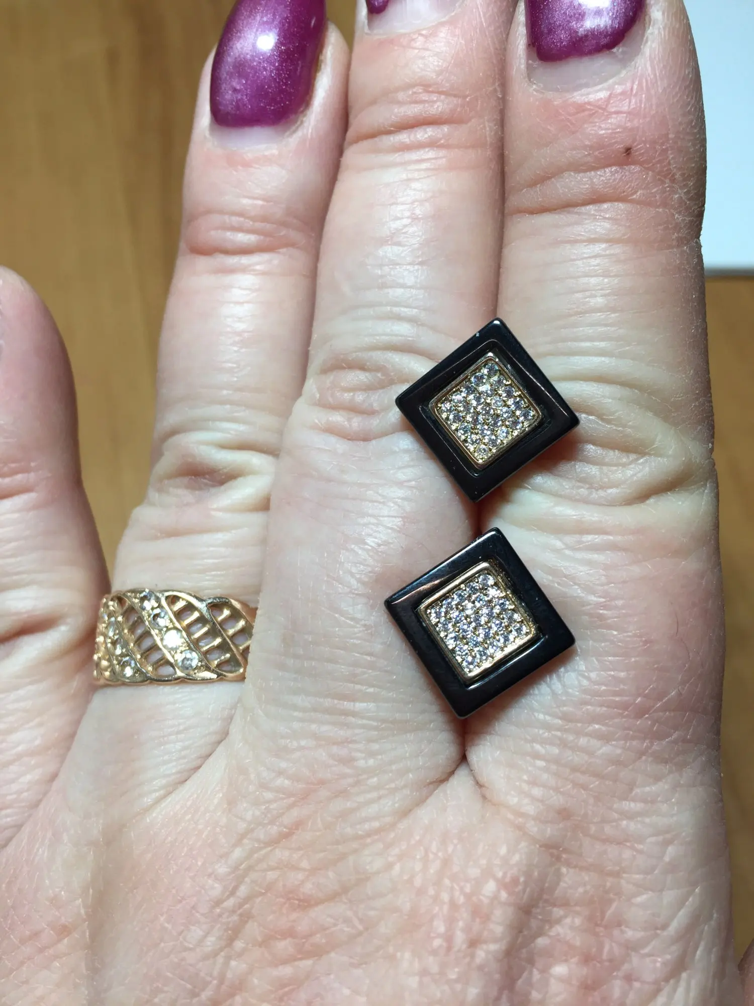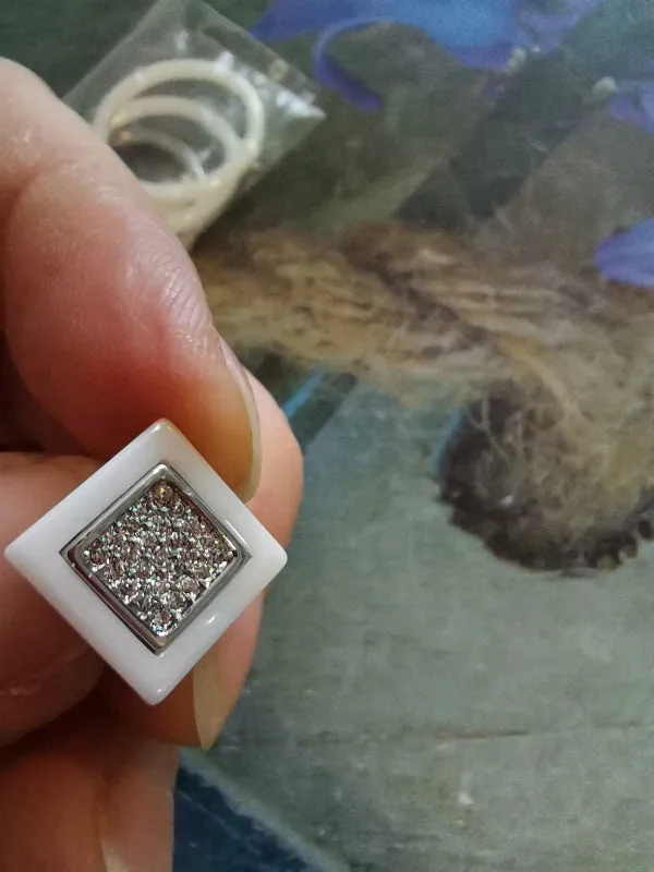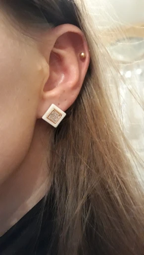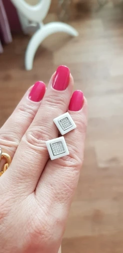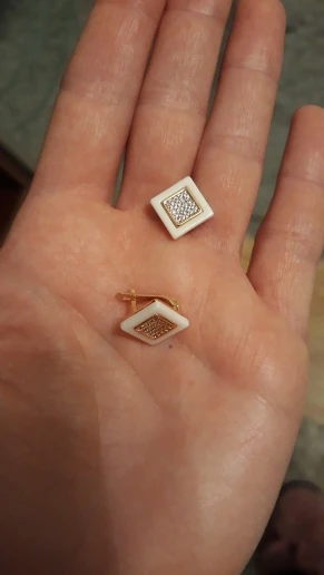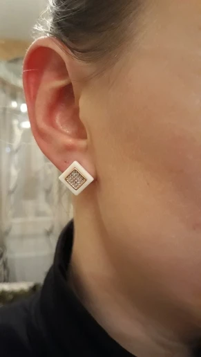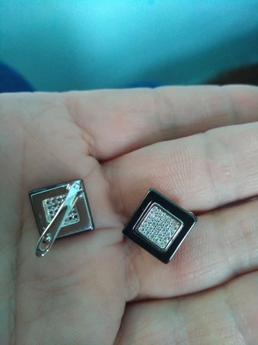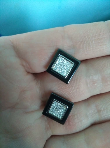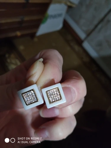 Заказ шёл три недели. Размер стороны квадрата 1см. Я думала, что это керамика, но это скорее всего просто белое стекло. Стразы все на месте. Единственное, что расстроило, маленькая застёжка, из-за этого серёжки на ухе кажутся гвоздиками и в целом очень маленькими. Посмотрим, как будут носиться.