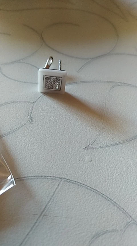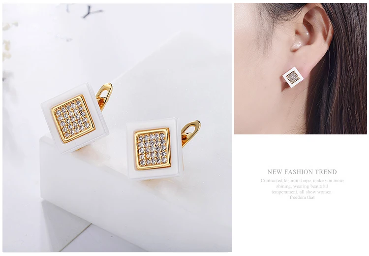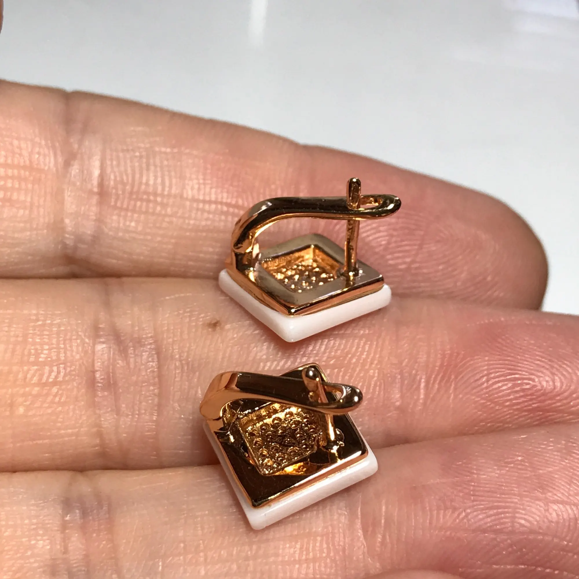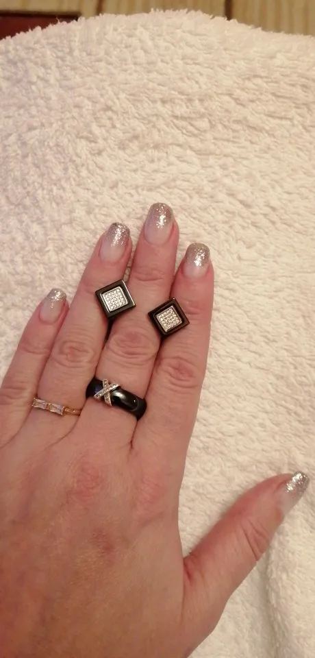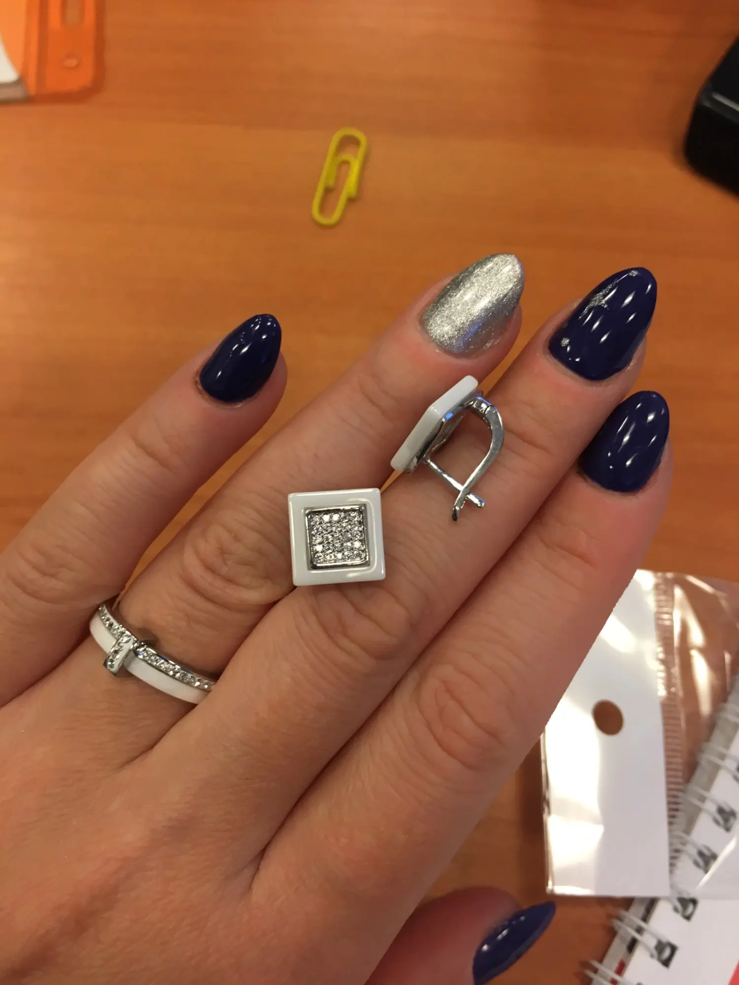 Заказ шёл три недели. Размер стороны квадрата 1см. Я думала, что это керамика, но это скорее всего просто белое стекло. Стразы все на месте. Единственное, что расстроило, маленькая застёжка, из-за этого серёжки на ухе кажутся гвоздиками и в целом очень маленькими. Посмотрим, как будут носиться.
