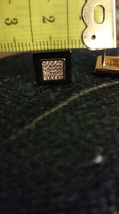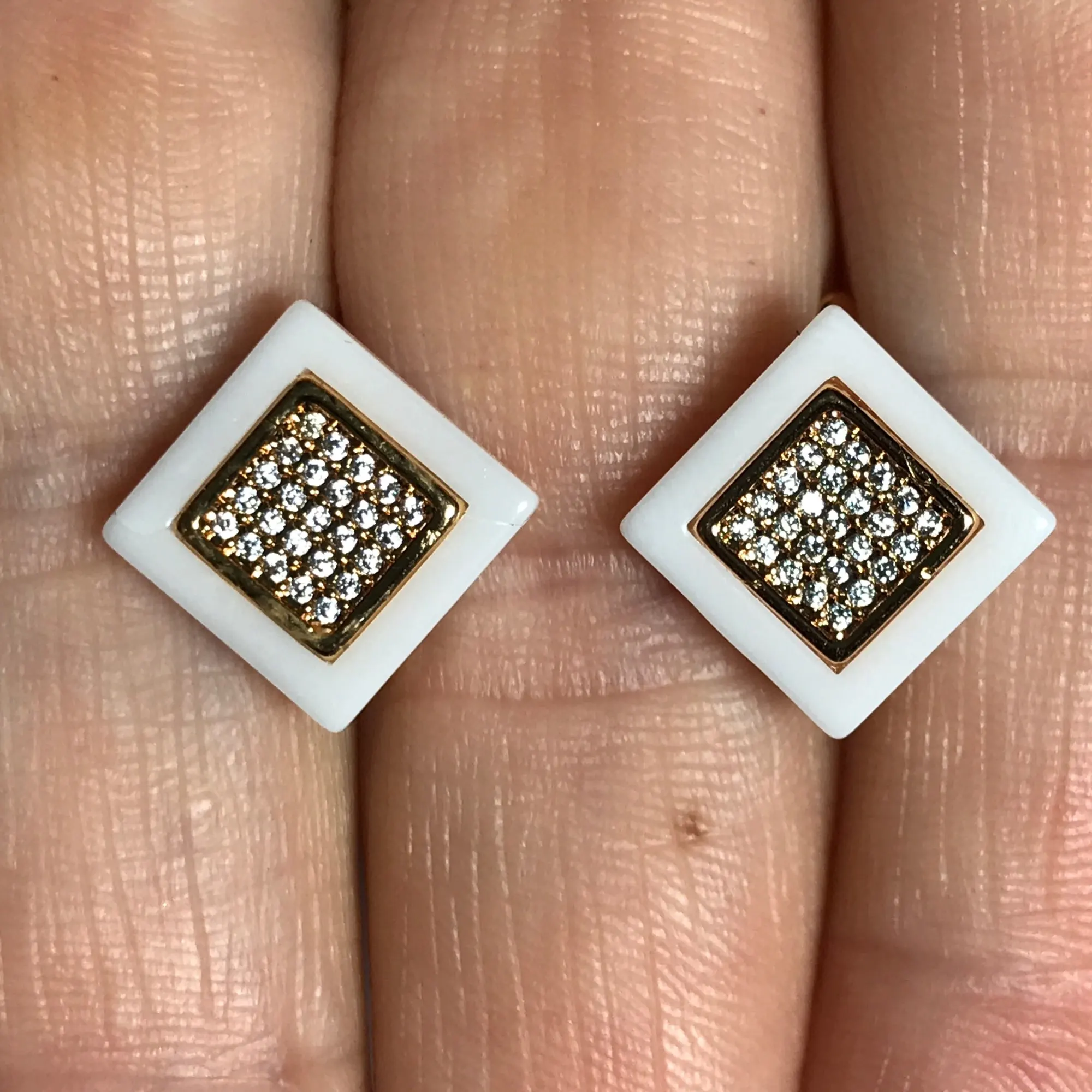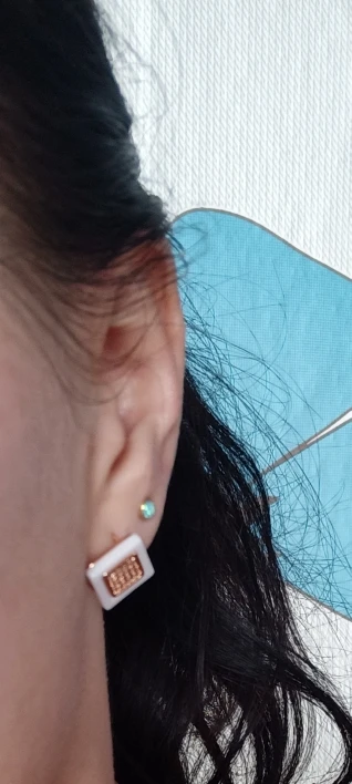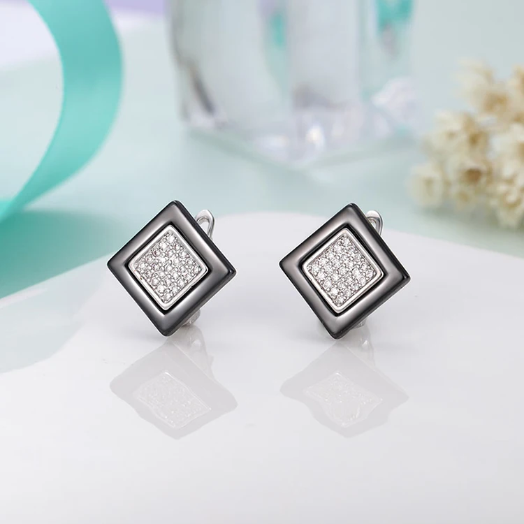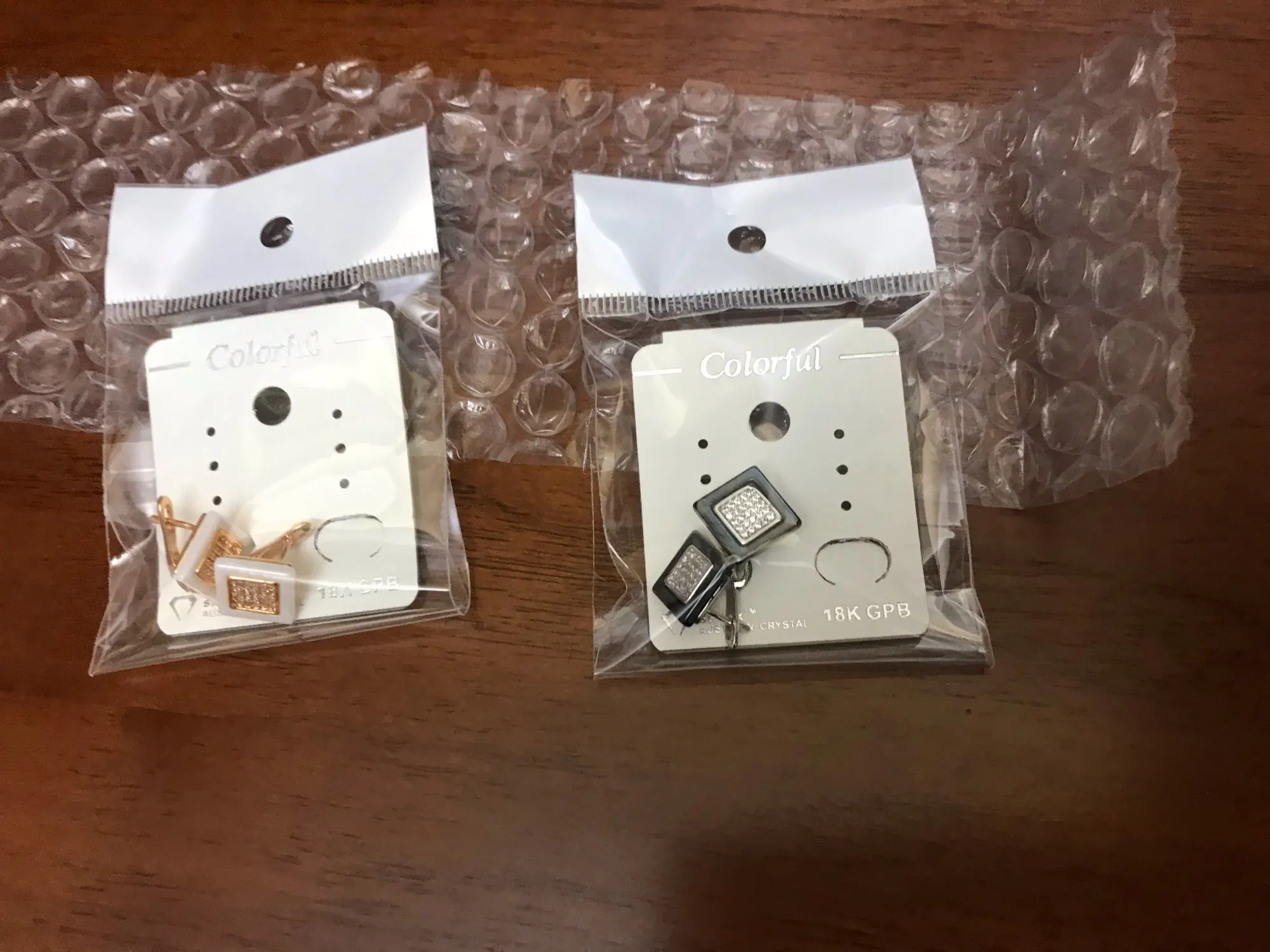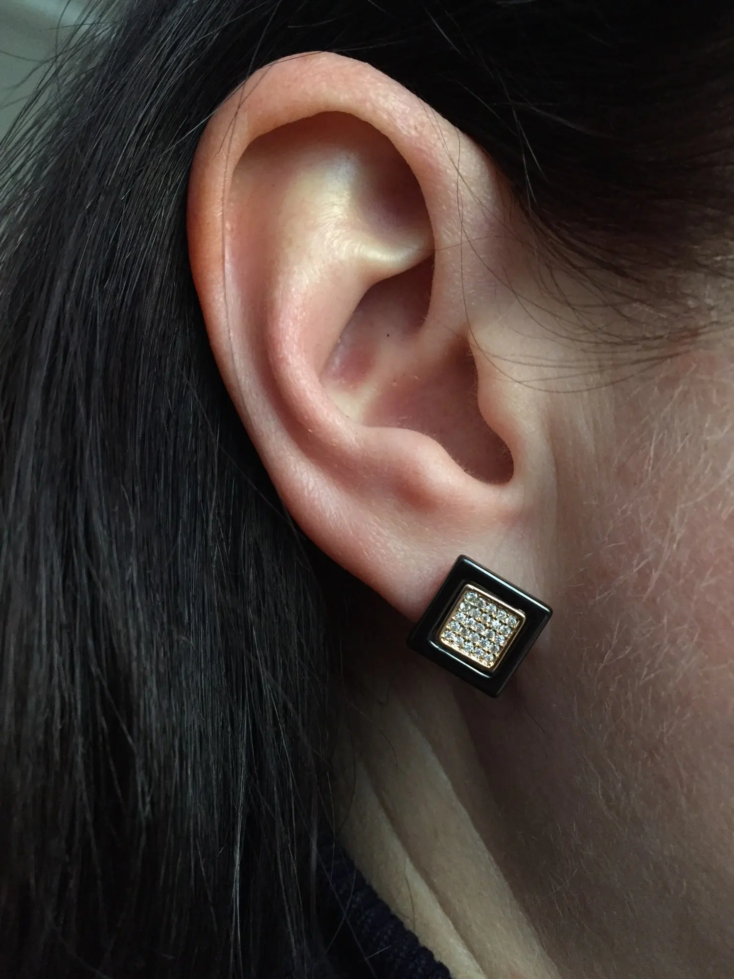 Заказ шёл три недели. Размер стороны квадрата 1см. Я думала, что это керамика, но это скорее всего просто белое стекло. Стразы все на месте. Единственное, что расстроило, маленькая застёжка, из-за этого серёжки на ухе кажутся гвоздиками и в целом очень маленькими. Посмотрим, как будут носиться.