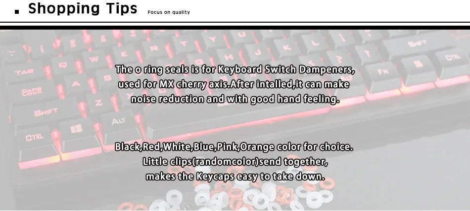 Посылка дошла за 20 дней. Колечки в меру твердые. Если хочется тишины и совсем короткого хода, то можно надеть 2 кольца на один кейкап. Одного кольца хватает чтобы убрать пластиковый звук при нажатии