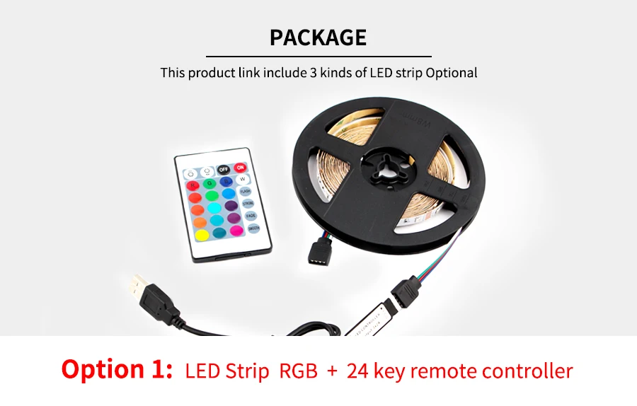Вариант 1: Светодиодная лента, 1 шт. RGB + 24-кнопочный пульт дистанционного управления, 1 шт.(Батарея CR2025 в комплект не входит)