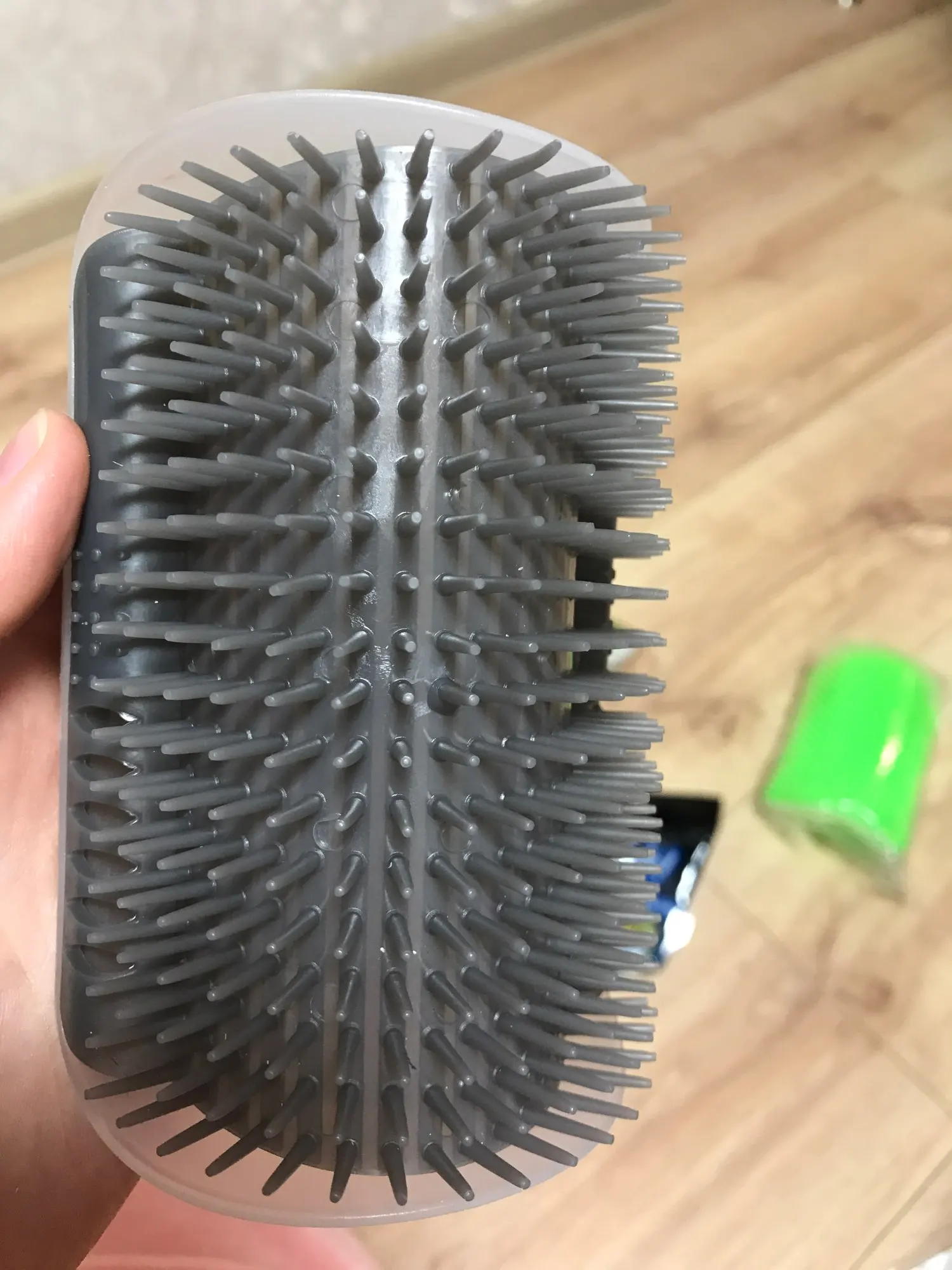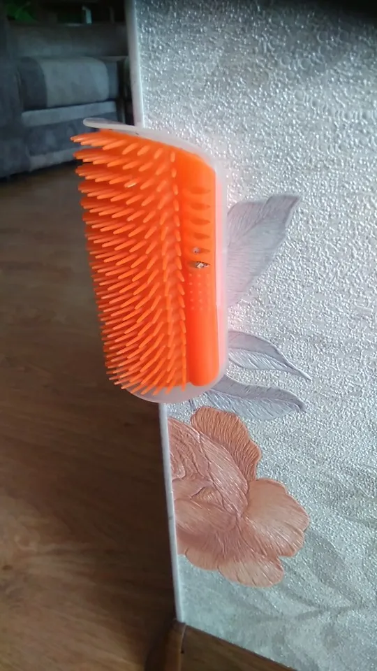 Прикольная щётка. пока не прикрепили. Но кот почесался и погонял по полу с удовольствием. В набор вкладывают пакетик с кошачьей мятой))).