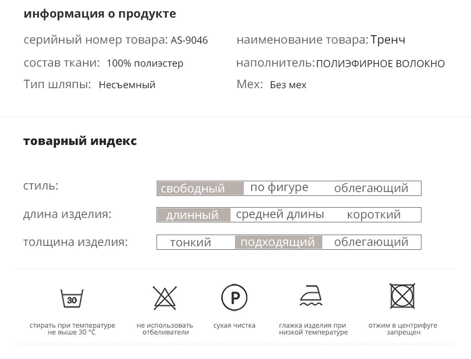 Тренч XL соответствует описанию, подошел на российский 50 размер. На рост 154 см рукава длинные, придется укоротить. Швы аккуратные. Ткань хорошо гладится, похоже, что будет мяться. Заказ доставлен в течении 10 дней. Это мой второй заказ в этом магазине, качеством обслуживания очень довольна, огромное спасибо продавцу.