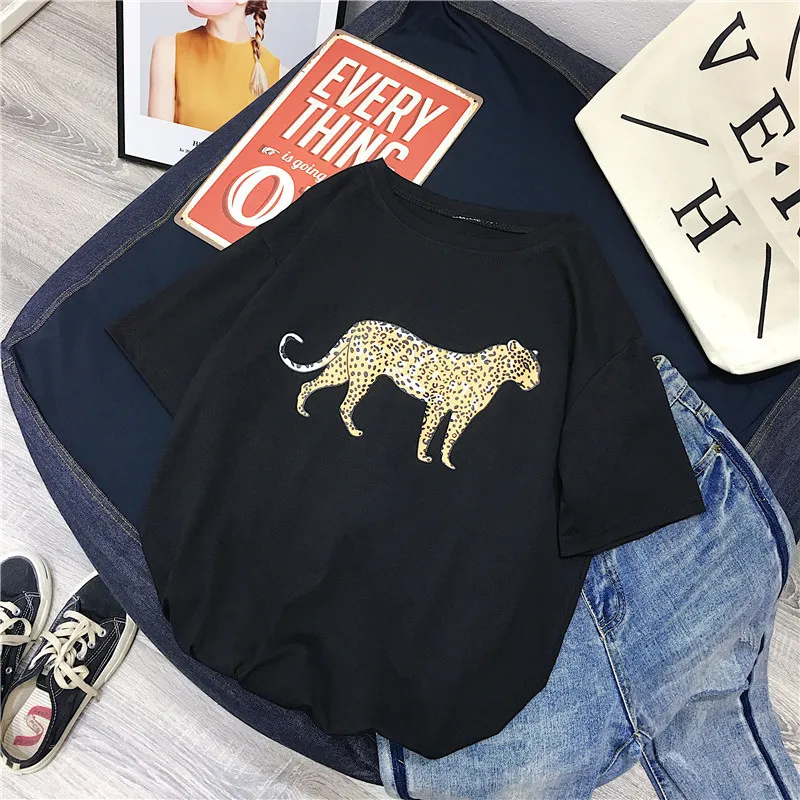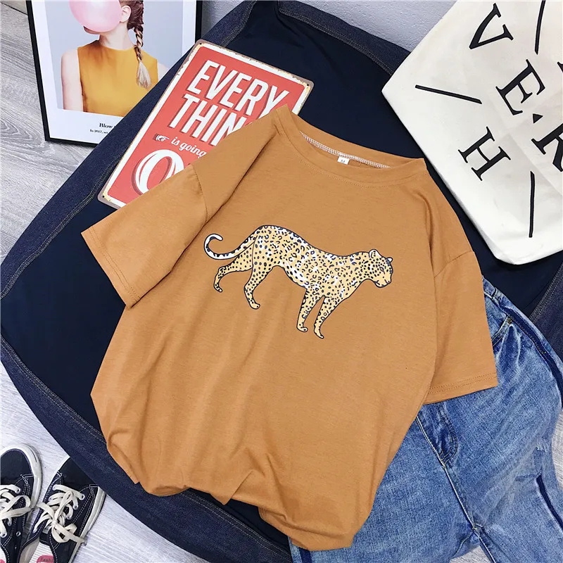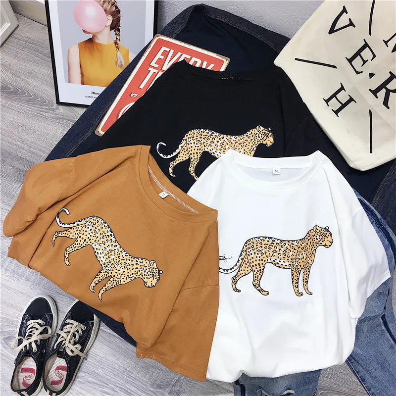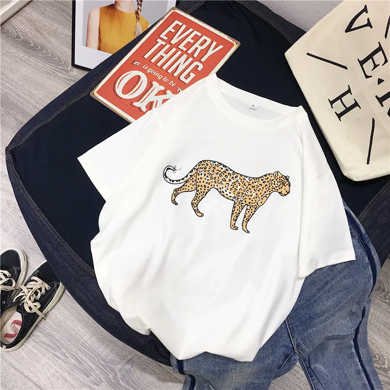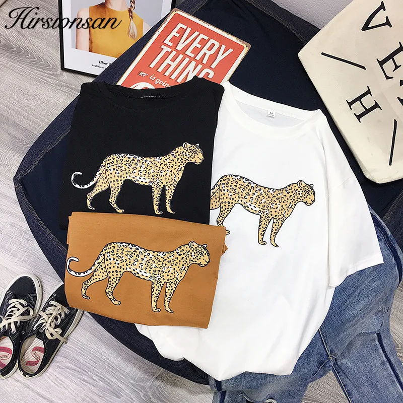 Футболка Hirsionsan женская с круглым вырезом, свободная рубашка из 2019 хлопка с леопардовым принтом, с коротким рукавом, белый черный топ в стиле Харадзюку, на лето