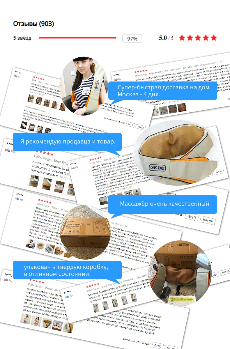 Супер быстрая доставка(заказ 27.11-доставка 05.12 в Саратов) курьером до двери. Массажёр опробовала, не супер сильная скорость, но мне понравилось, есть проблема с шейным отделом, проминает достаточно, чтобы почувствовать себя лучше. Много писать нет смысла, отзывов положительных много, я рекомендую этот товар на данный момент времени, а как будет работать дальше отпишусь позже.