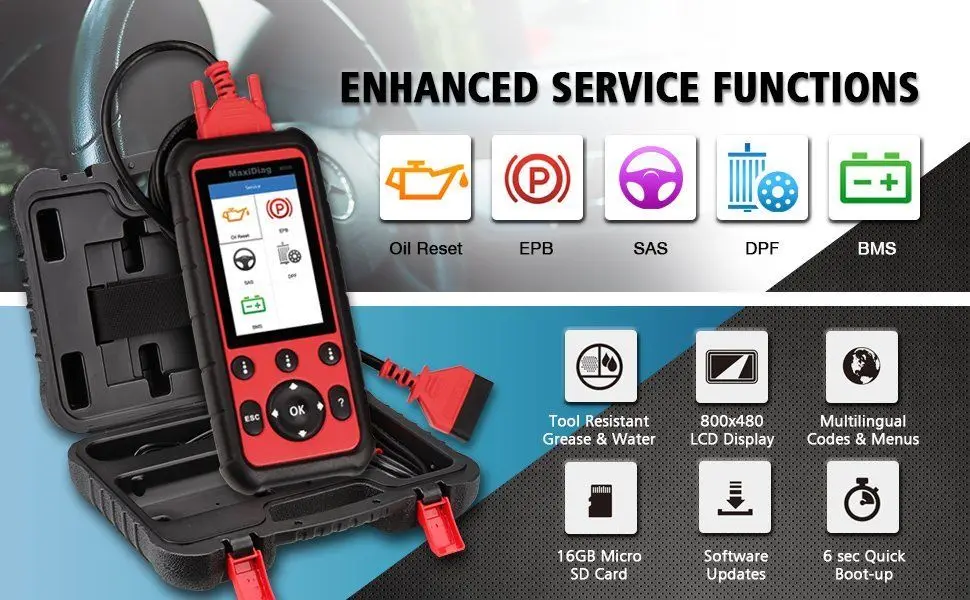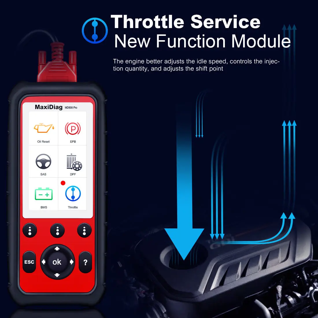 MaxiDiag MD808 Pro создан, чтобы перевести ваш диагностический опыт на совершенно новый уровень. Загружен сбросом обслуживания масла, регистрация и сброс батареи, парковочная тормозная колодка повторно учатся после замены, датчик угла поворота рулевого управления и дизельные функции регенерации фильтра твердых частиц, MD808 Pro может получить доступ ко всем доступным модулям для лучших операций по диагностике. Со всем, что заключенная в 4-дюймовый ручной прибор, нет лучшего Многофункциональный сканирующее устройство на рынке.