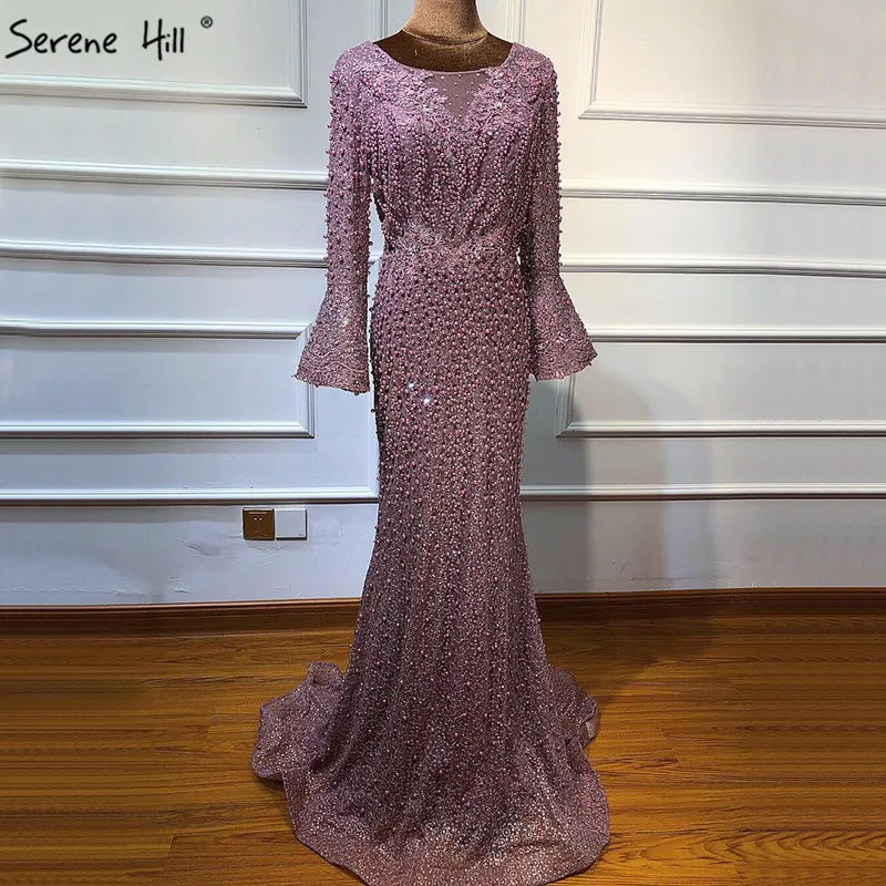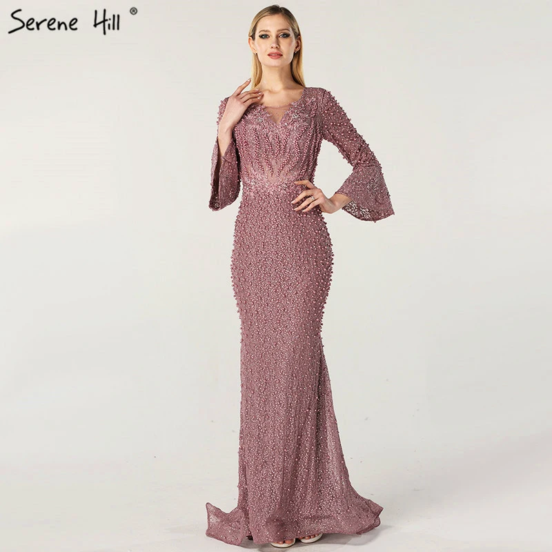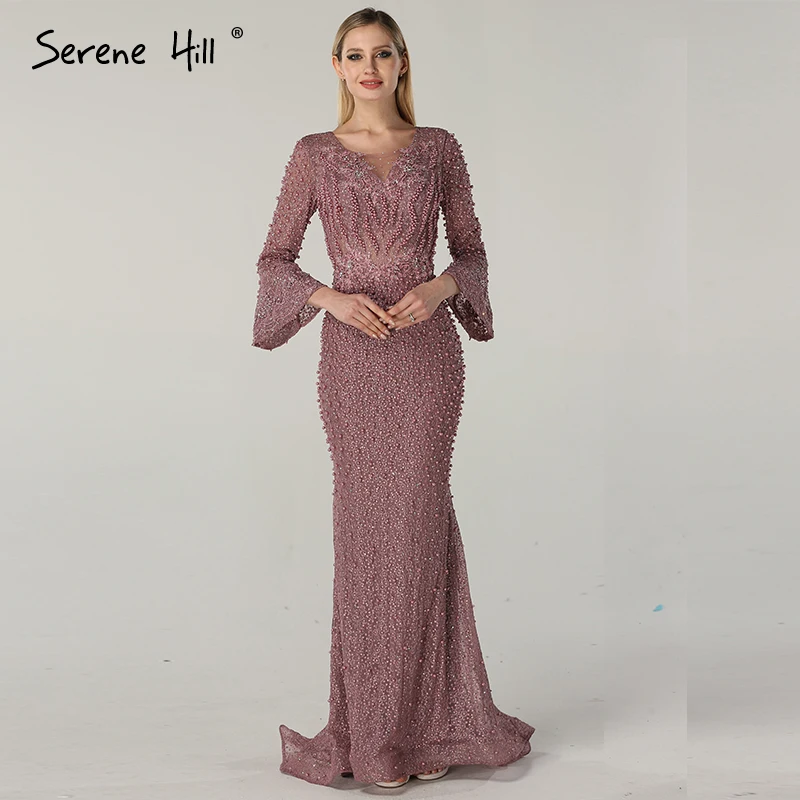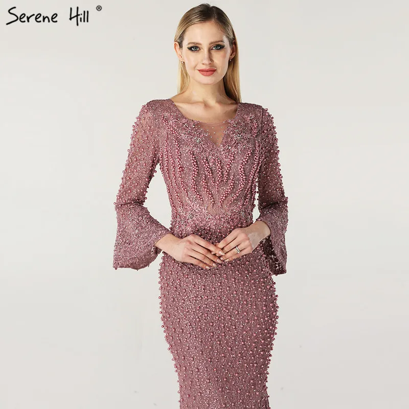 Мусульманское розовое роскошное вечернее платье с длинным рукавом, украшенное жемчугом, модель 2020 года, Дубай Serene Hill кружевные платья в официальном стиле BLA60813