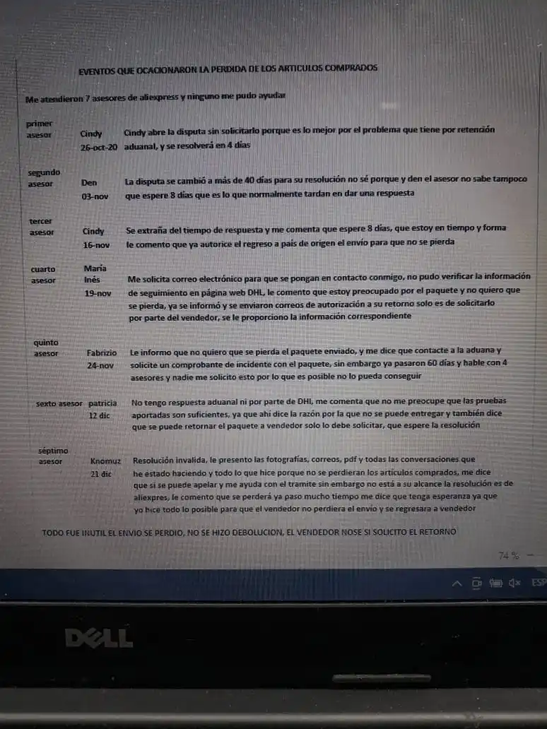 No llego articulo comprado, y la DISPUTA no la puse yo la puso el primer asesor que me atendio, lo unico que hice fue preocuparme por que el vendedor recibiera su paquete y que no se perdiera, no se podia entregar en Mexico, asi les informe, la disputa fua invalida, a pesar de que 7 asesores me atendieron y todos conincidian que era valida, el paquete enviado solo se podia regresar a vendedor, en mas de 400 pedidos es la primera calificacion negativa, ni siquiera pongo esto cuando llegan descompuestos. Nose porque la disputa se resolvio en poco mas de 60 dias cuando deben de dar una respuesta en 8 dias, con el paso de tanto tiempo yo no hay respuesta de las autoridades competentes. Supongo el vendedor no tubo el suficiente interes en proporcionar un buen servicio justo. Anexo las pruebas correspondientes espero se puedan leer en las fotos