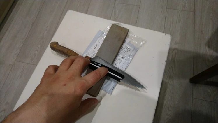 нормальная приспособа. на новом ровном бруске точит хорошо, главное смачивать его. заказал ещё так как пластик будет со временем стираться.