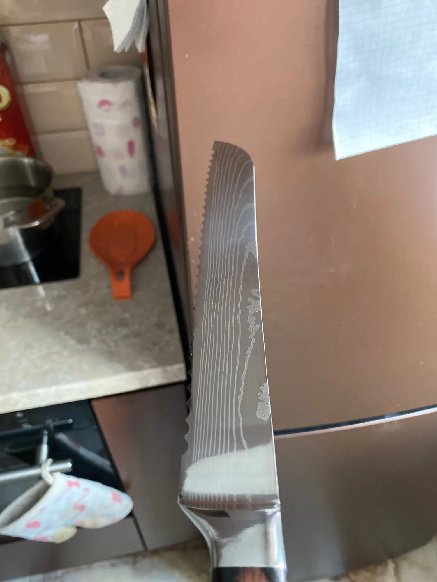 Хорошего качества продукт. Отлично изготовлен. В меру тяжёлый, большой. Острый, хорошо режет хлеб, сыр. Красивый рисунок по лезвию. Не вздумайте подумать, что это натуральная Дамасская сталь с рисунком. Нет конечно. Эта пародия на неё, но хорошая и качественная, соответствует стоимости данного продукта.