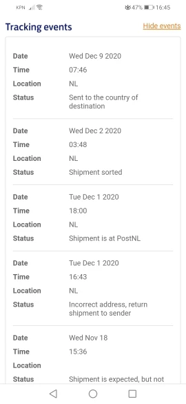 Продавец никогда не прибыл, это большой осквернитель и не возвращайте деньги, посылка была отправлена обратно PostNL (см. Изображение), но этот лжец говорит, что это был deleverid в моем почтовом отделении, по какой-то причине postnl вернул эту посылку обратно отправителю в Китае. Я связался с PostNL и PostNL также сказал, что они вернули эту посылку обратно в Китай. LZ409895545CN Поэтому люди из мира не покупают у этого лжеца и негодяев. Поэтому люди из мира не покупают у этого обманщика