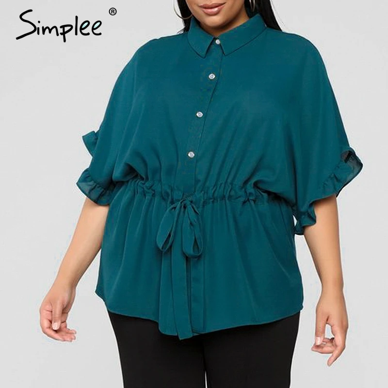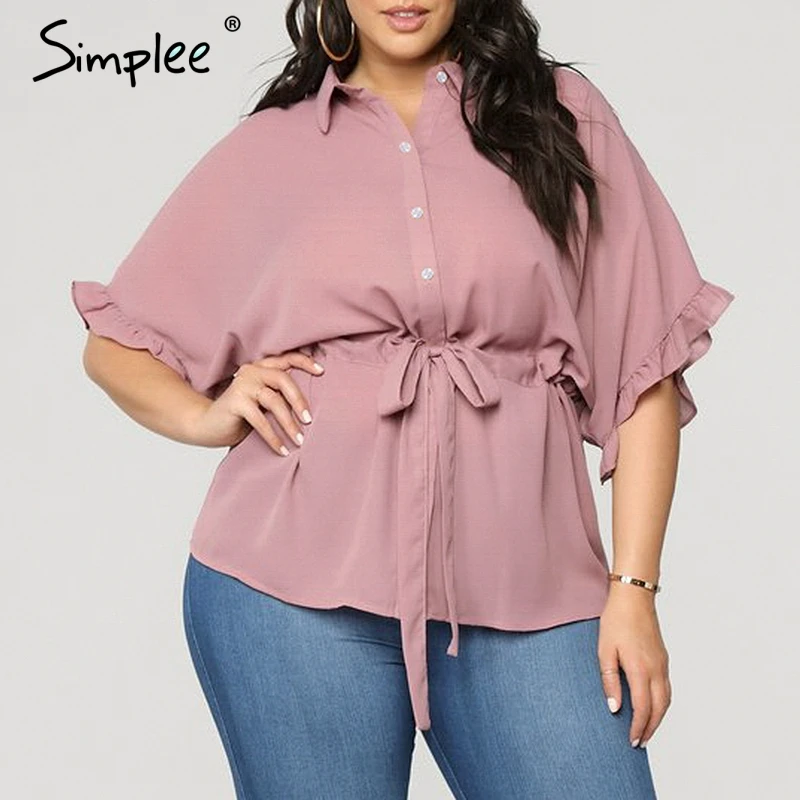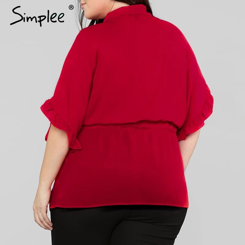 Женская блузка Simplee большого размера с рюшами, женская рубашка с коротким свободным рукавом, с поясом, топ, летние одноцветные повседневные и деловые топы и блузки