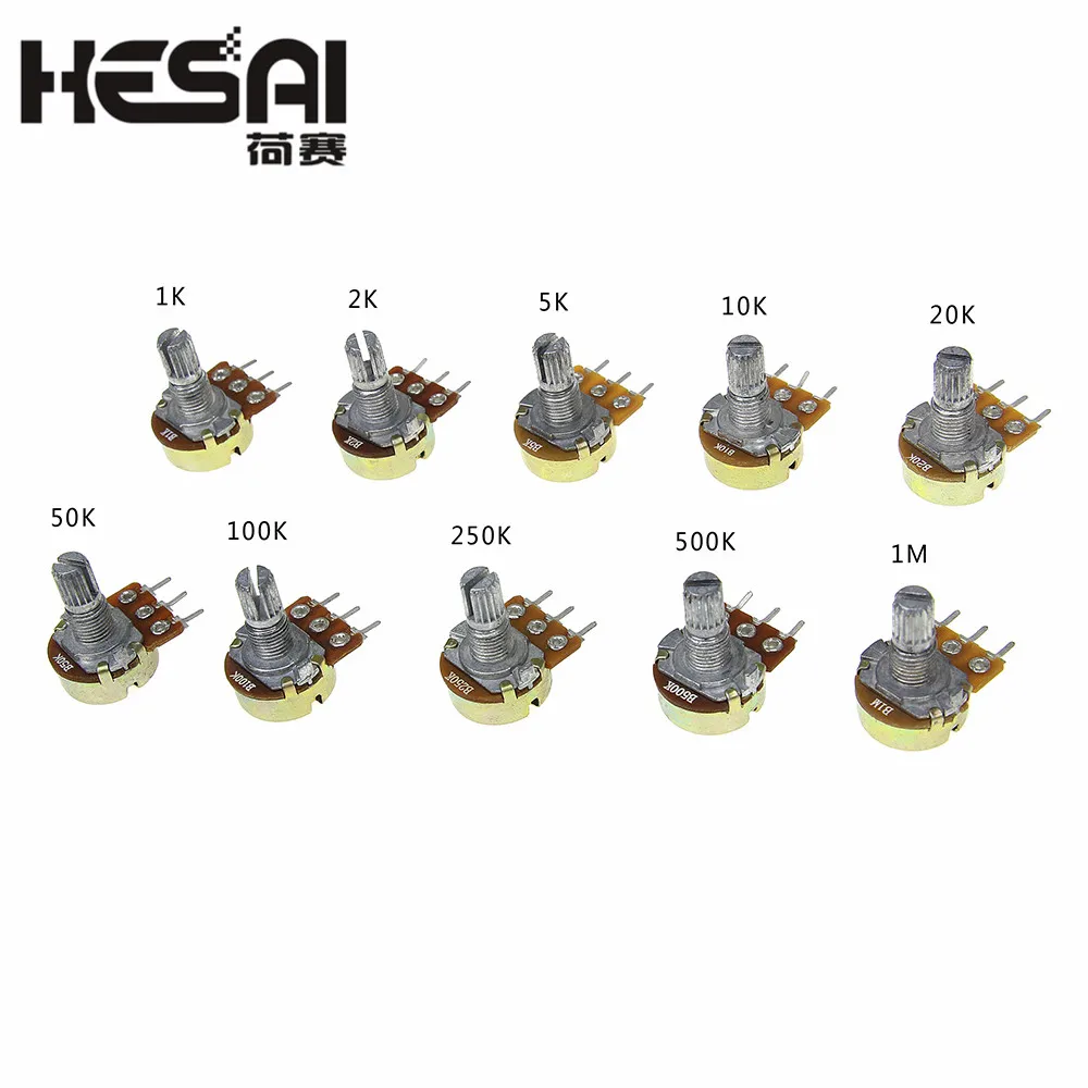 Линейный потенциометр WH148, 5 шт.лот, B1K, B2K, B5K, B10K, B20K, B50K, B100K, B250K, B500K, B1M, 15 мм, вал с гайками, шайбы, 3-контактный, WH148