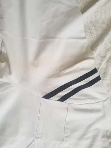 Во-первых, воротник слишком широк, не соответствует остальным размерным параметрам. И во-вторых, отделка полосками на плечах - не белыми, как на фото, а серого цвета, что, конечно же, делает внешний вид несколько хуже.