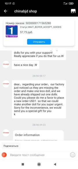 Я заказала две одинаковые куклы. Продавец по ошибке отправил одну куклу, попросил заплатить один доллар, чтобы отправить вторую куклу. В качестве извинения обещал отправить подарок. Со второй куклой никакого подарка не было. Когда я написала продавцу, он сделал вид, что не понимает о каком подарке идёт речь. Куклы пришли в шлифовочной пыли, других нареканий нет. Очень недовольна сервисом.
