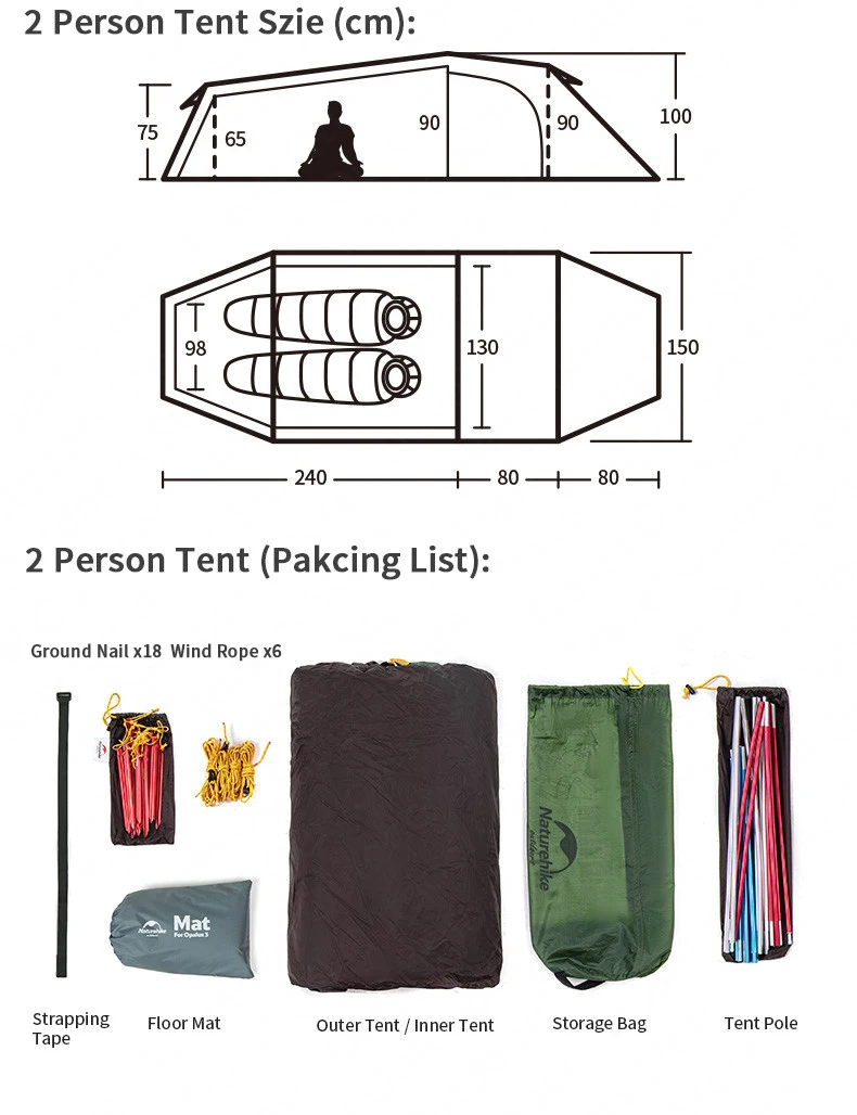 Внешняя палатка: 210T полиэстер плед (210T) / 15D нейлон силикон (15D) -Водонепроницаемый 3000 мм