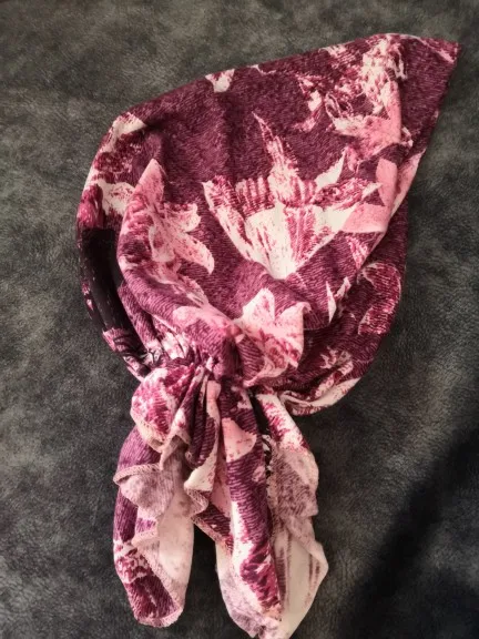 Платок симпатичный и как раз на мою большую голову! Обычно резинки давят, здесь резинка свободная. поэтому, если голова маленькая, будет болтаться. А мне как раз то, что нужно!