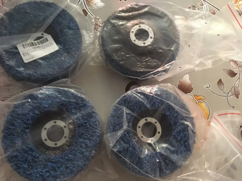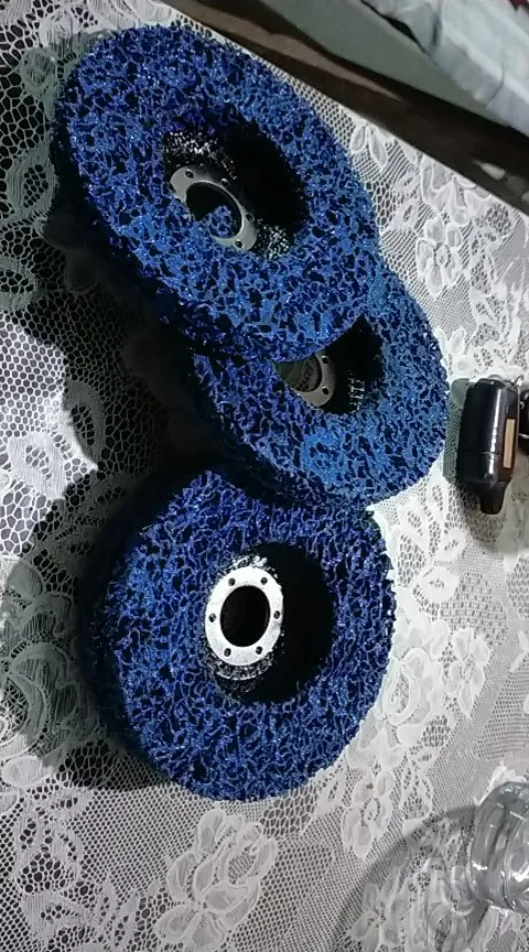 .Доставка без повреждений и в полной комплектации за 19 дней. До этого брал фиолетовый на 125х22мм. Чистил 8 полок металлических стеллажей. Износ 75%. Прочитал, синие попрочнее - буду проверять. Не любит заусенцев и выступающих частей. Желательно заусенцы предварительно обработать металлическими щетками. Для сильно ржавых поверхностей не подходит - большой износ. Ключ для установки дисков должен иметь штифты высотой 15-20мм. Стандартный ключ не подходит.