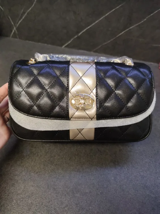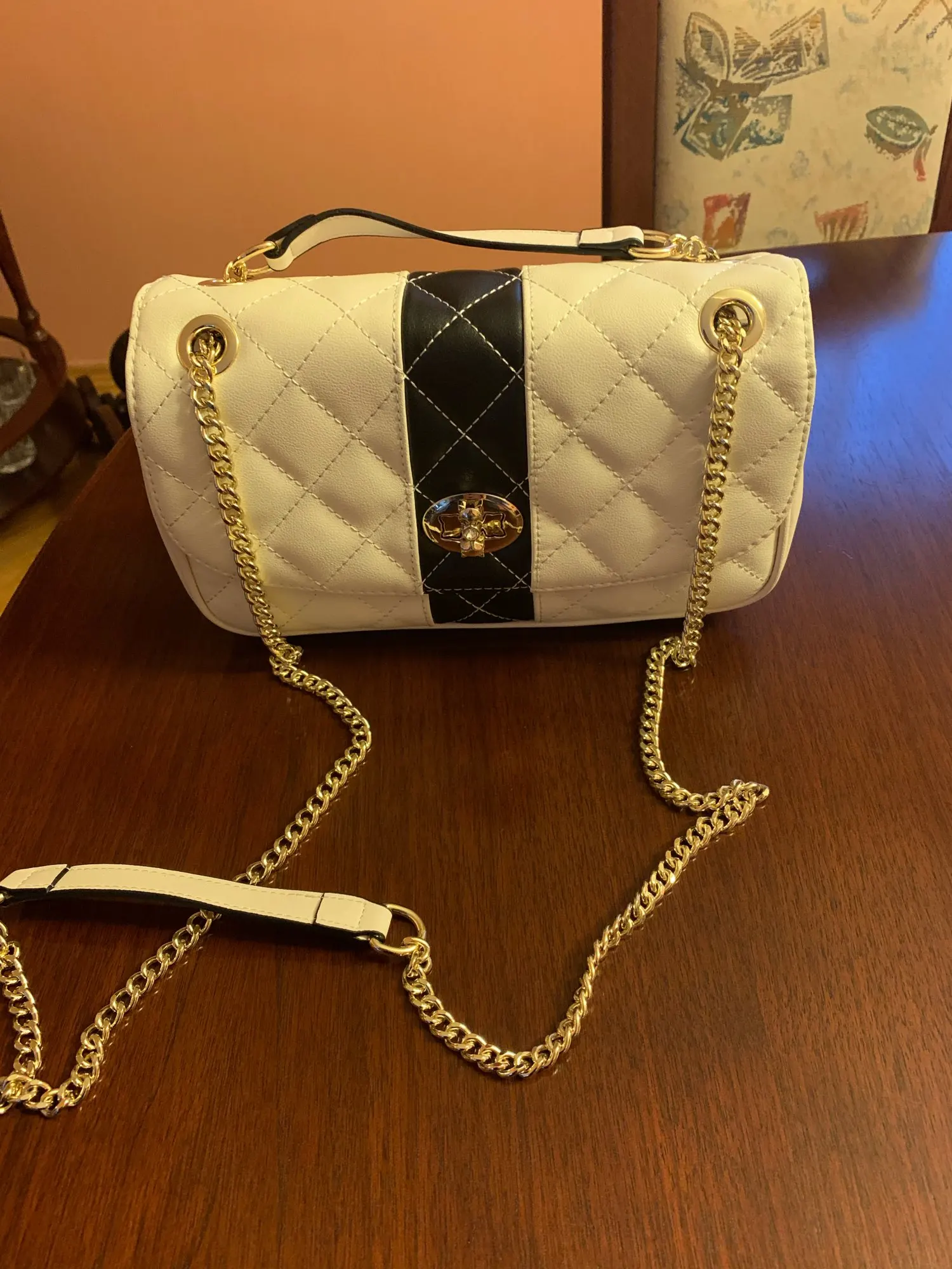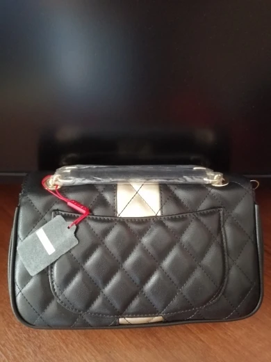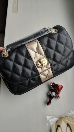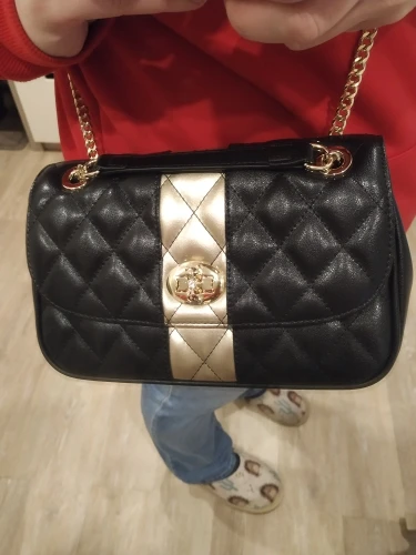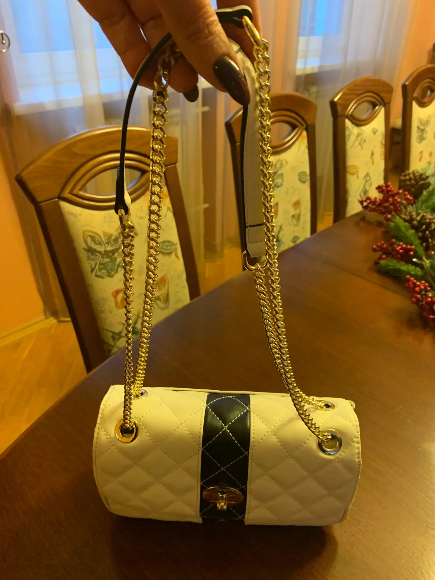 сумочка очень приятная - смотрится хорошо, полоска в центре неброская - я покупала ходить в театр) с пальто, с платьями смотрится очень классно! понравился ремешок-цепочка, который можно носить как двумя ручками, так и на одной, при этом также удобно. рекомендую к покупке однозначно