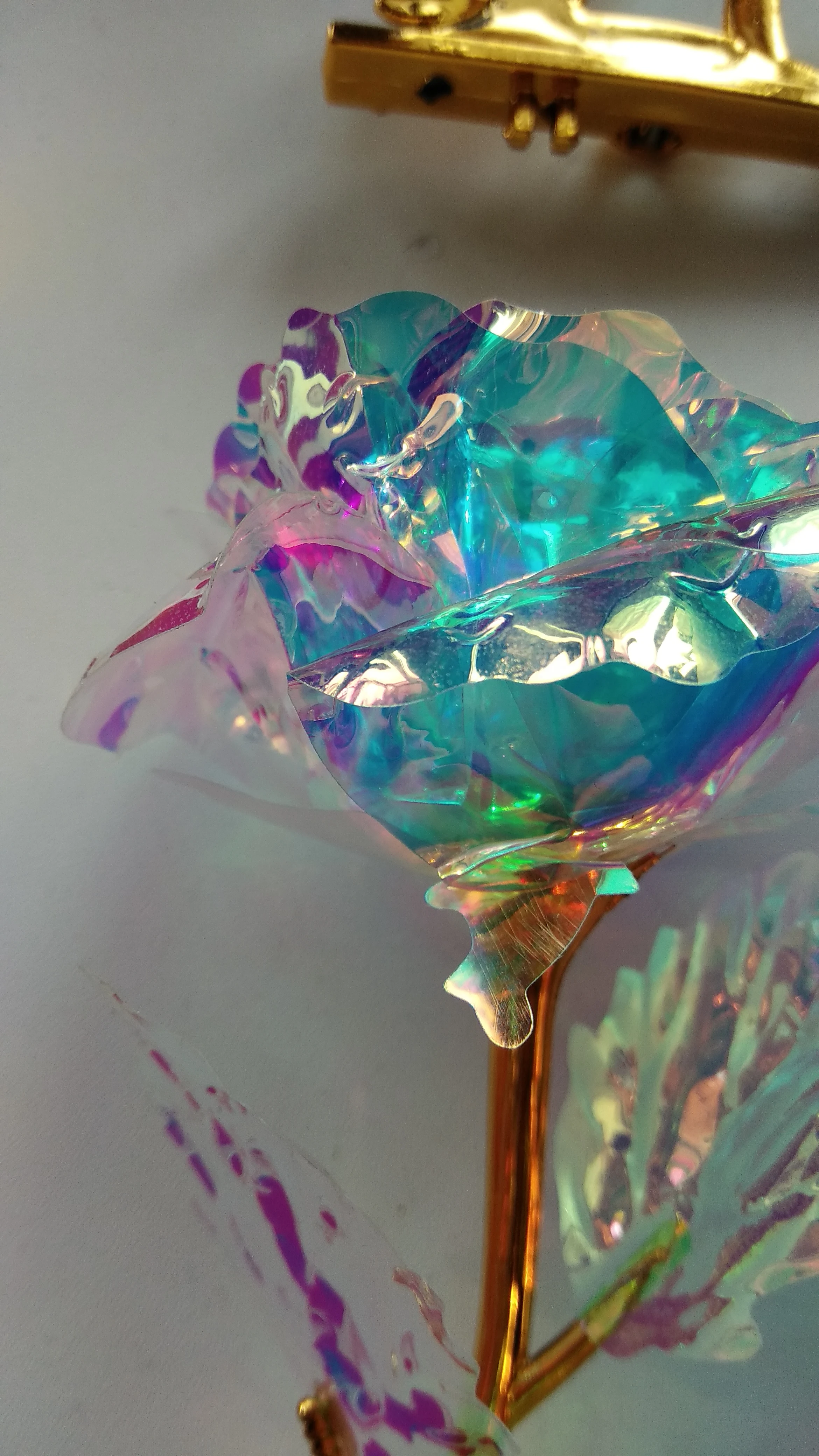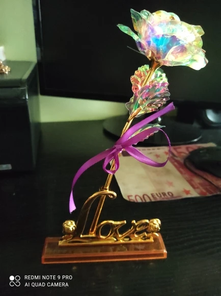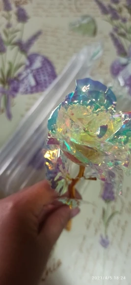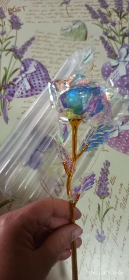 Коробка была сломана и Роза была слегка повреждена на листьях. Стоит 24-каратного золота, он сделан из чистого пластика, в противном случае это красиво выглядит.