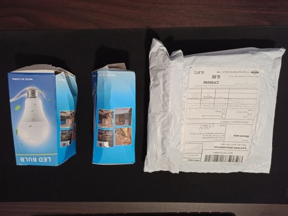 Пришла в общей сборной посылке. Никак не защищена, в простом тонком пакете. Коробка помялась, но лампочка выжила. Работает нормально, реагирует на движение.