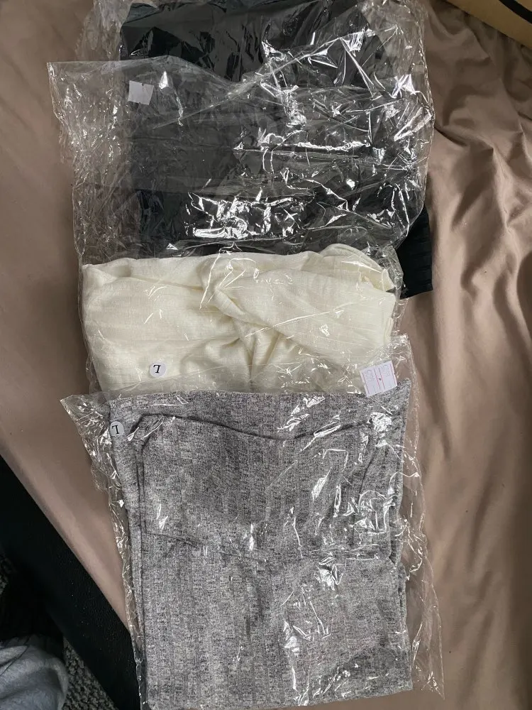 материал неплохой, но кофты отличаются формой от тех,что на фото, у меня все кофты по плечам подошли а внизу болтаются как колокол, пришлось отдавать в ателье ушивать