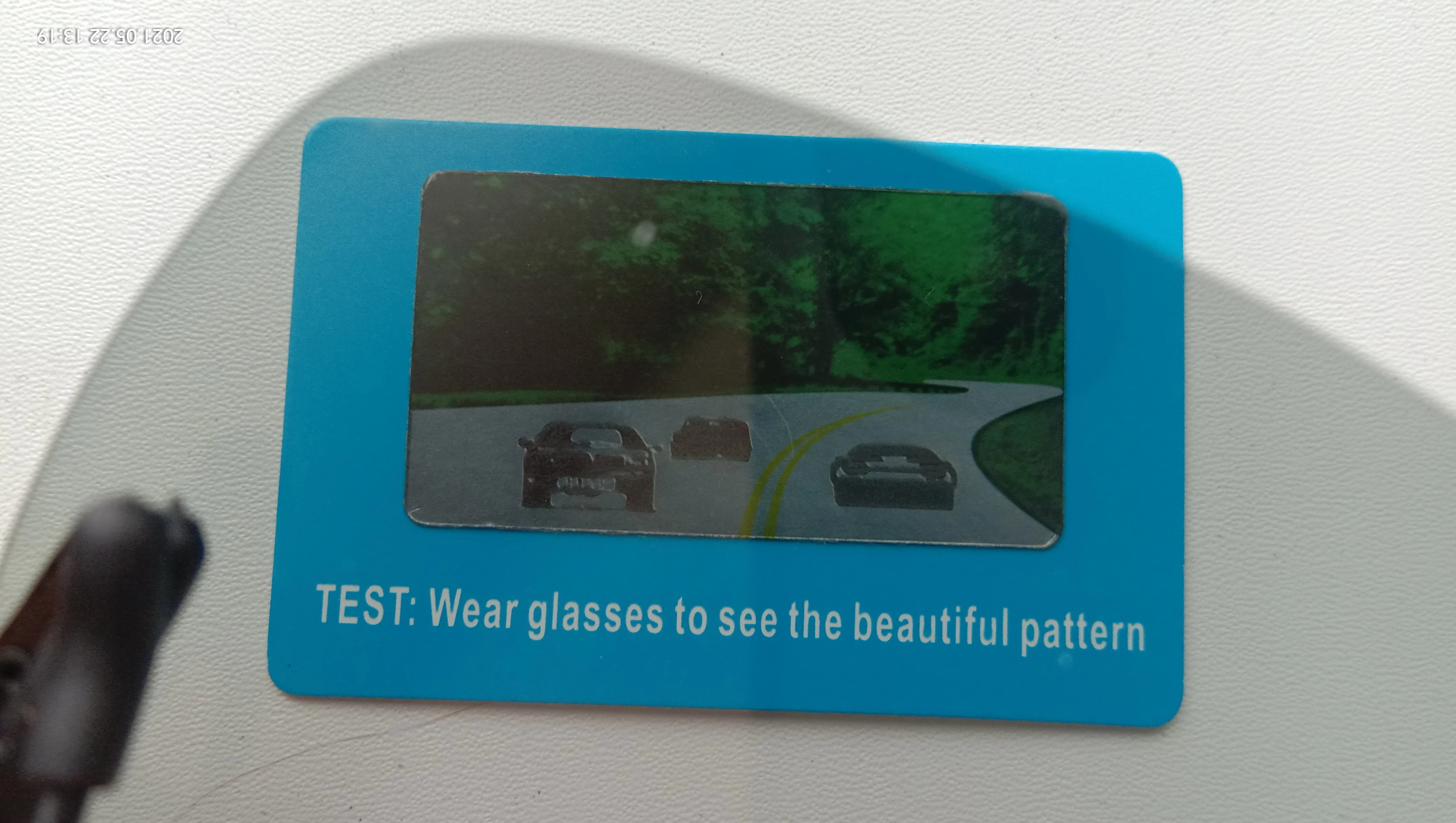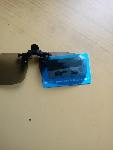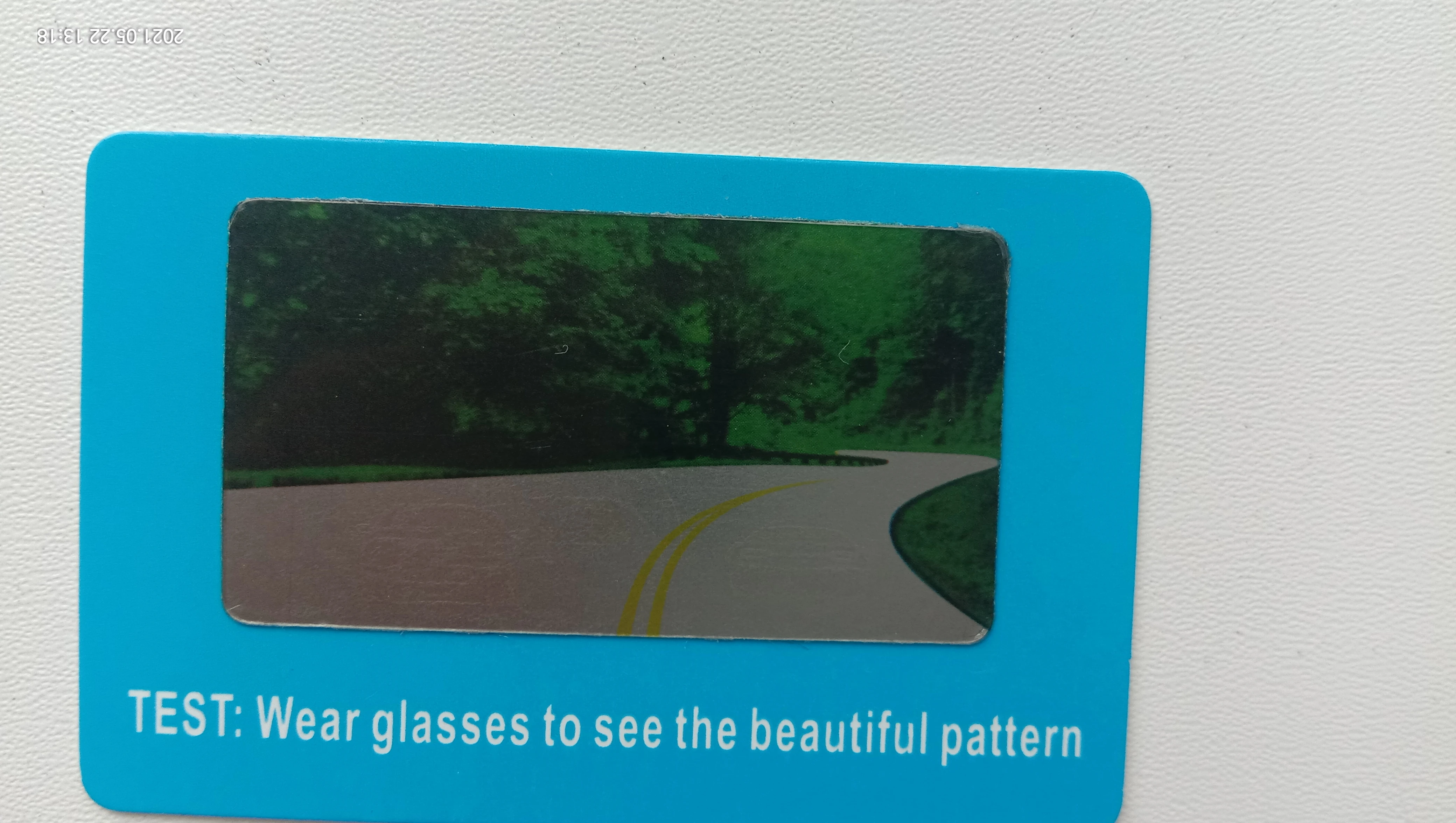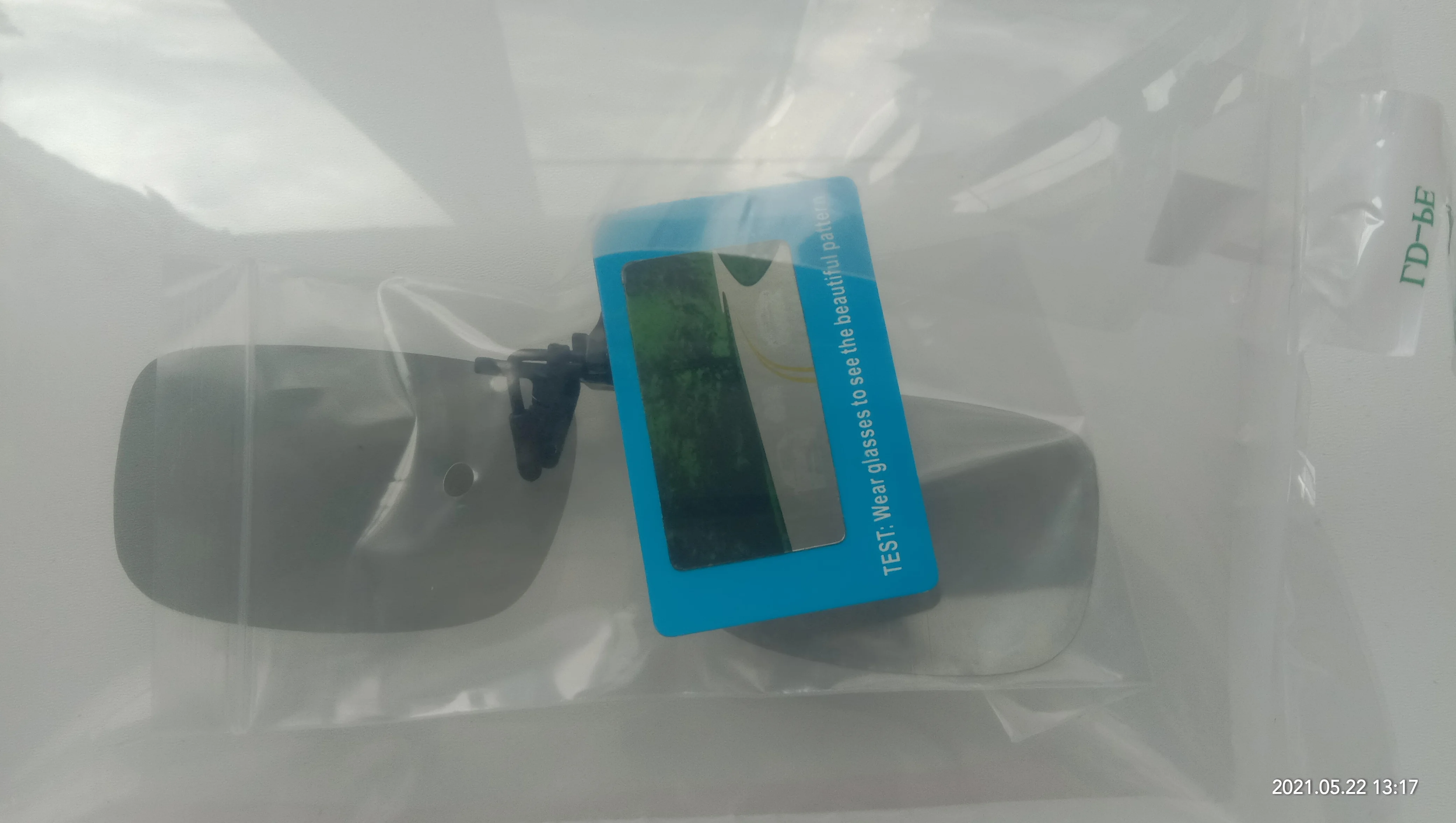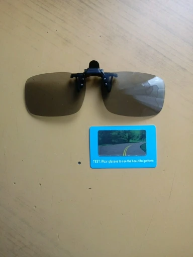 Прилагается пластик для проверки что очки поляризационные: дорога на фоне леса. Если смотреть через очки, то становятся видны на дороге машины.