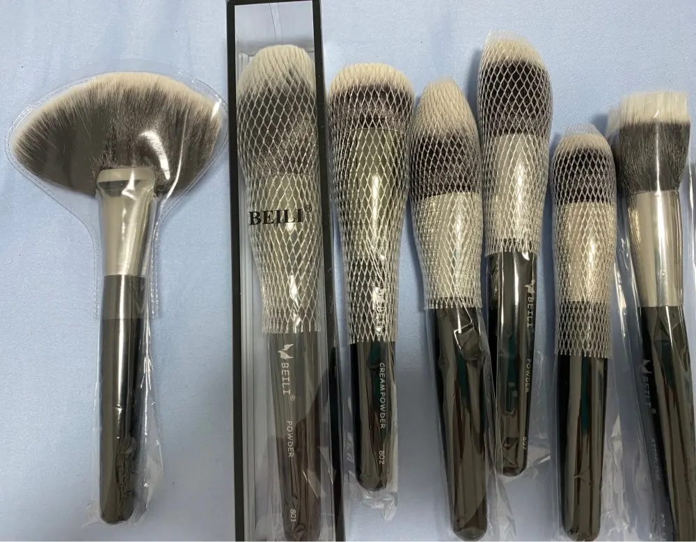 Отличный набор. Осмотрела только визуально,пока не пользовалась. Часть кистей из натурального ворса,часть синтетика, очень мягкие. Большие кисти помещены в мешочки,сеточки и кроме того металлическая часть запечатана)). Пришел очень быстро.