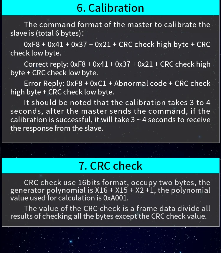 0x41 код функции предназначен только для внутреннего использования (адрес может быть только в том случае, 0xF8), используется для заводскую калибровку и вернуться к заводским настройкам обслуживание случаев, после того, как код функции для того, чтобы увеличить 16-бит пароль, пароль по умолчанию 0x3721