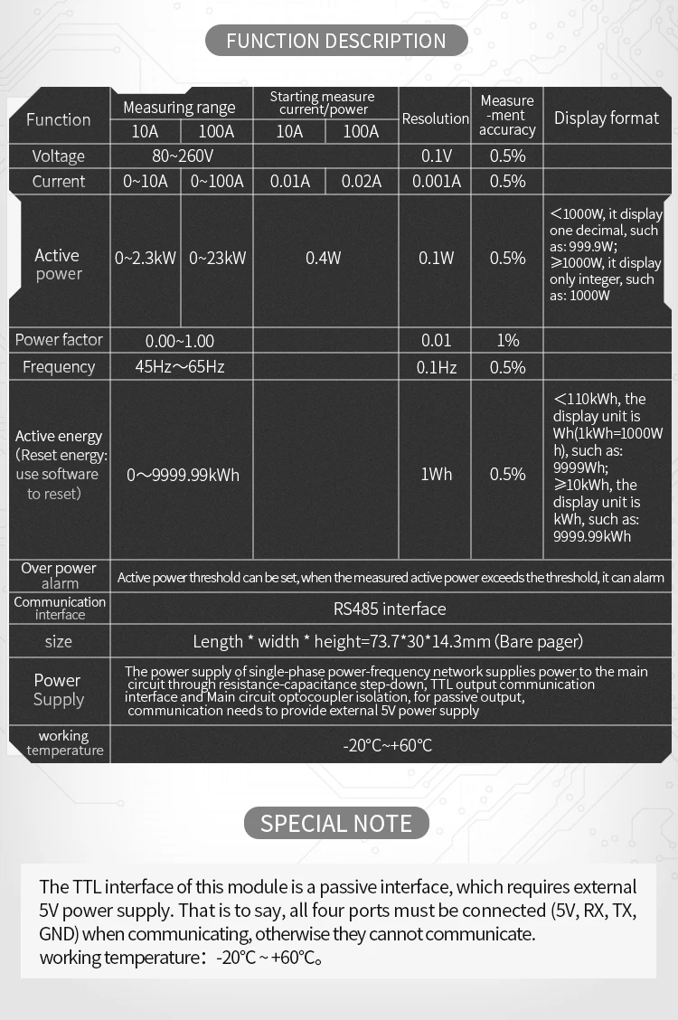 Этот документ описывает спецификацию PZEM-004T модуля связи переменного тока, модуль в основном используется для измерения напряжения переменного тока, тока, активной мощности, частоты, коэффициента мощности и активной энергии, модуль Без функции отображения, данные считываются через интерфейс TTL.