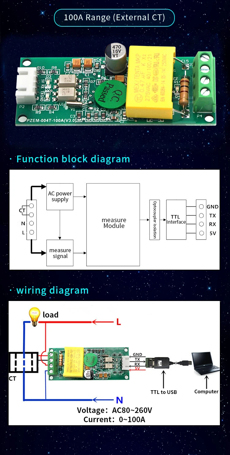 1.2.1 Диапазон измерения: 0 ~ 10A(PZEM-004T-10A); 0 ~ 100A(PZEM-004T-100A)