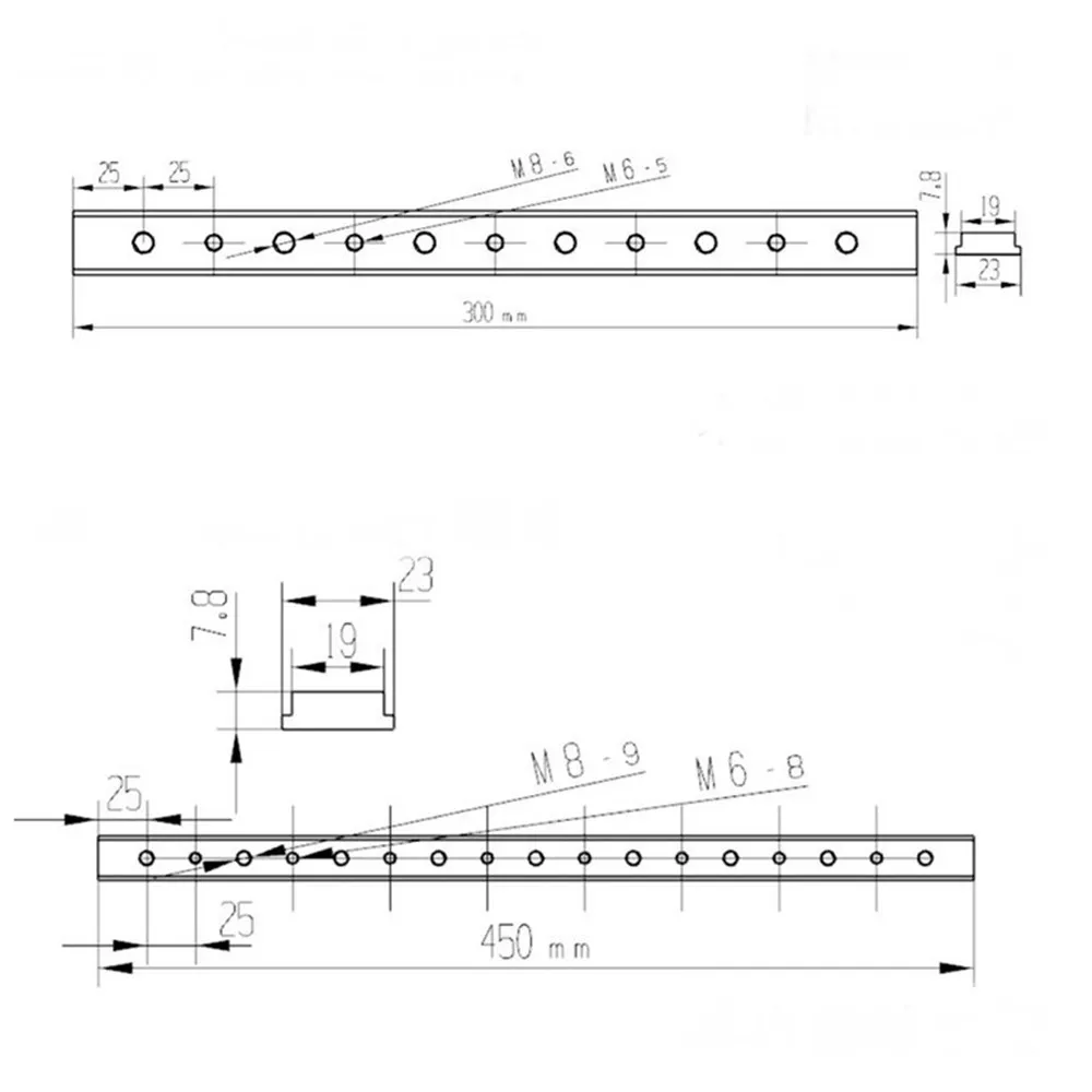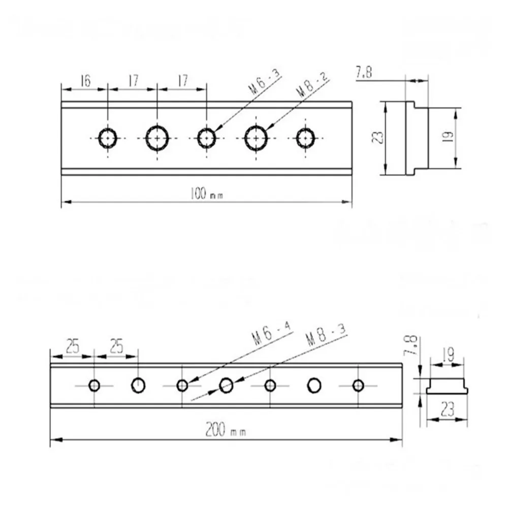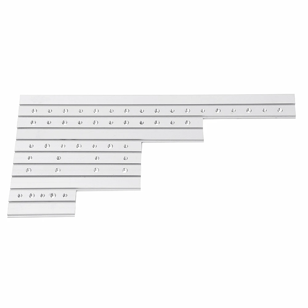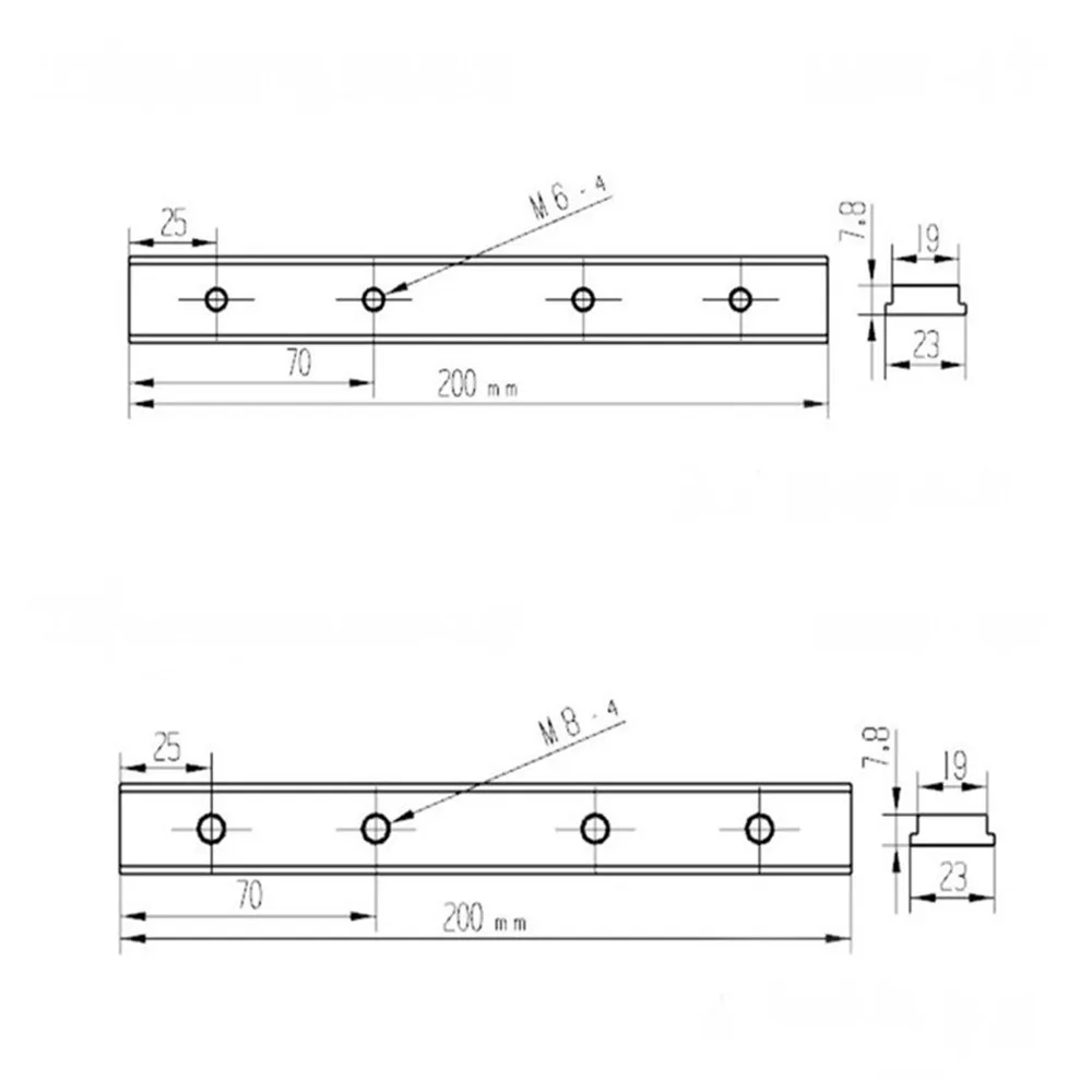 Товар Длина Отверстие Количество резьбы #1 100 мм Нет / #2 100 мм Да 3 шт. M6 + 2 шт. M8 #3 200 мм Нет / #4 200 мм Да 4 шт. M6 + 3 шт. M8 #5 200 мм Да 4 шт. M6 #6 200 мм Да 4 шт. M8 #7 300 мм Нет / #8 300 мм Да 5 шт. M6 + 6 шт. M8 #9 450 мм Нет / #10 450 мм Да 8 шт. M6 + 9 шт. M8Применение: T-slot T-track miter furniture track slot router table wood tools. Посылка включает в себя: 1 x скользящий блок