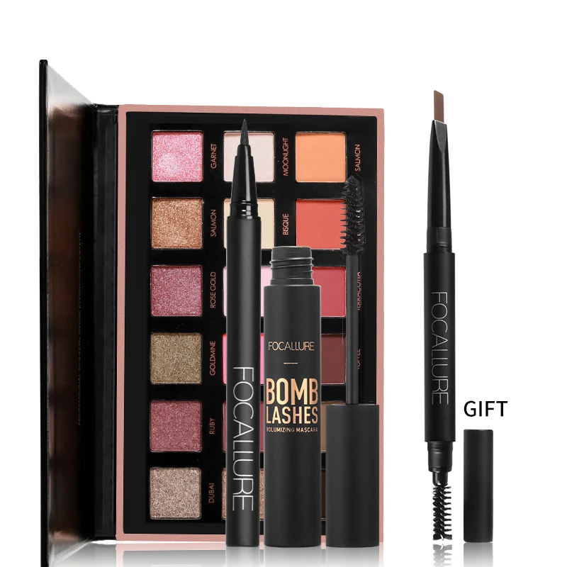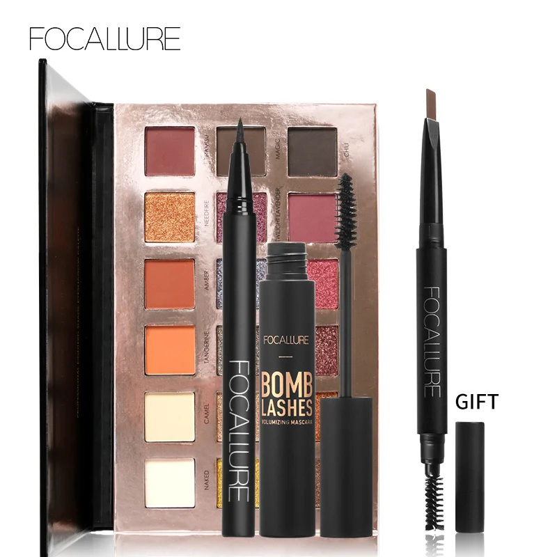 Набор для макияжа FOCALLURE с блестящей матовой палитрой теней для век 18 цветов Черная тушь для ресниц жидкая подводка Карандаш с бровями