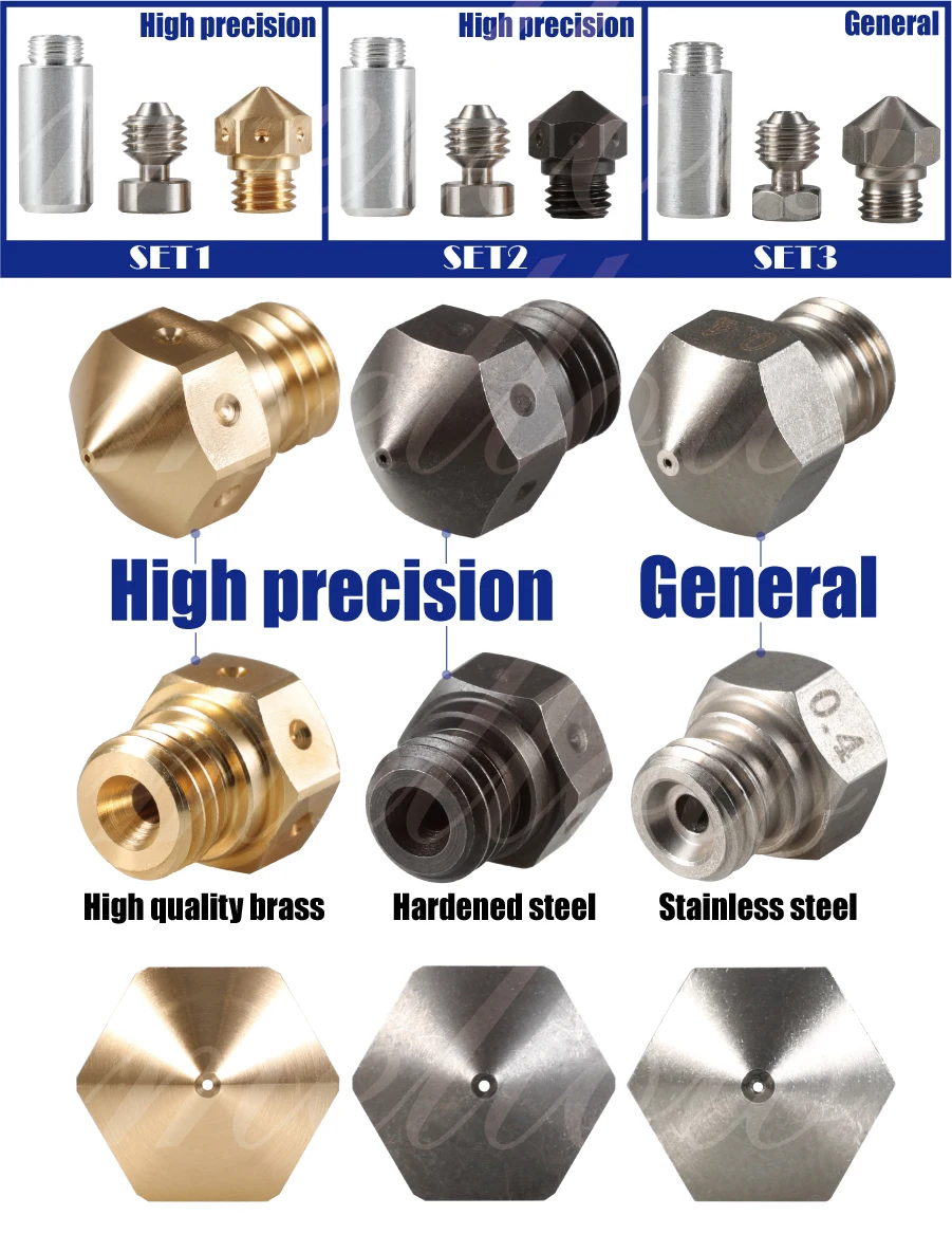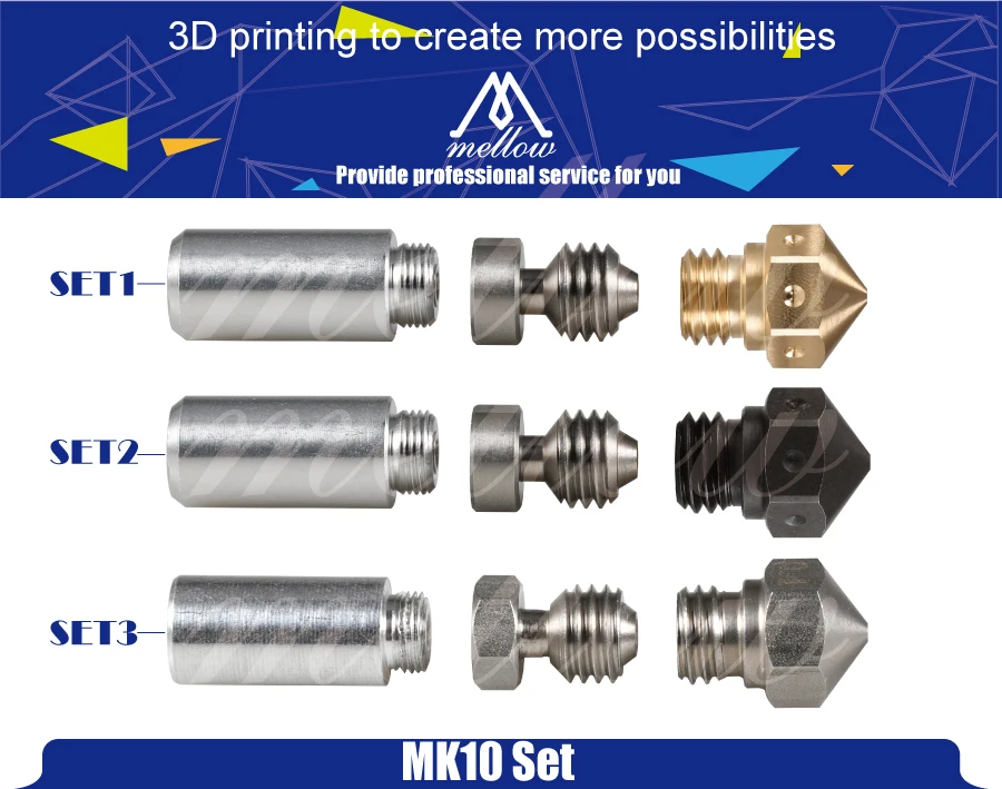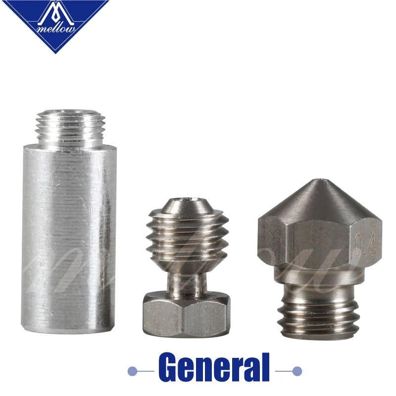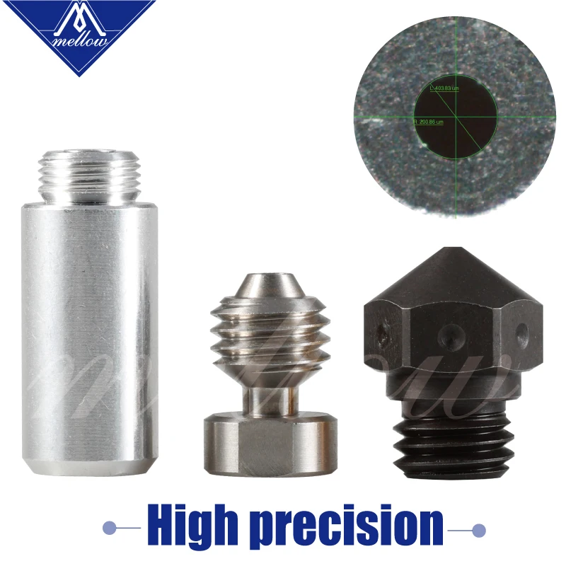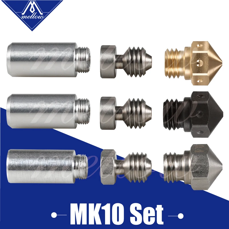 Это полностью металлический набор hotend upgrade для экструдеров MK10. Теплоизоляционная трубка изготовлена из 2 различных материалов. Нижний Тепловой разрыв сделан из нержавеющей стали, а более холодная верхняя часть сделана из алюминия. Нержавеющая сталь была использована для термального перерыва потому что она предлагает низкую термальную проводимость, и алюминий был использован для верхней части потому что она имеет Намного лучше теплопроводность, чтобы унести любое тепло от нити. Все металлические вставки позволяют печатать при гораздо более высокой температуре, чем это возможно, с оригинальной подкладкой из ПТФЭ. Еще одним преимуществом дизайна всех металлических наконечников является более последовательное управление камерой расплава. Во время медленной экструзии, в ПТФЭ облицовке hotend, переходная зона от твердого к расплавленному пластику, как правило, ползет вверх, создавая больше Жесткие принты. Со всем металлическим дизайном переходная зона всегда постоянна, находится прямо в разломе тепла. С быстрой скоростью экструзии, PTFE трубка не имеет достаточно теплопроводности, чтобы правильно расплавить весь пластик выходит. На экструдерах MK10 ограничение происходит около 60 мм/сек., в зависимости от размера сопла. Все металлические наконечники решают эту проблему, пластик окружен термически проводящее сопло по всей длине.