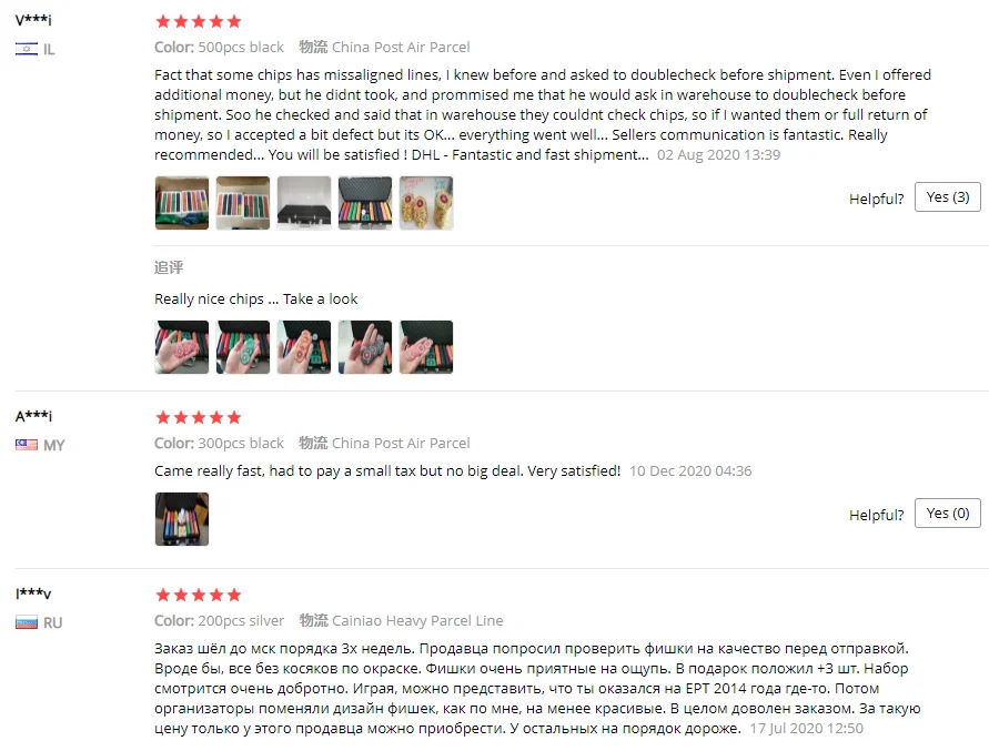 Эти фишки для покера отличные, они действительно стоят своих денег, но есть дополнительные расходы на доставку. Это стоит около 14 евро, но они были отправлены DHL, поэтому в основном в течение менее чем двух недель вы получите его, поэтому цена справедлива для этого. Чипы имеют действительно небольшую разницу в размере, в основном это трудно заметить. Но желтые сделаны с большим размером, который вы можете почувствовать и увидеть, таким образом, это плохой момент для этих чипов. Покерные карты в комплекте не отличные, не страшные, поэтому мое предложение заказать другие.