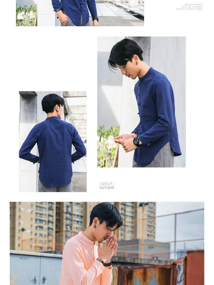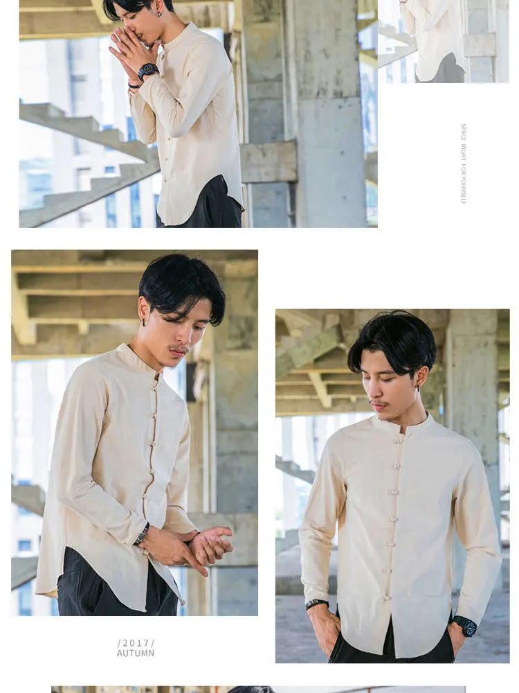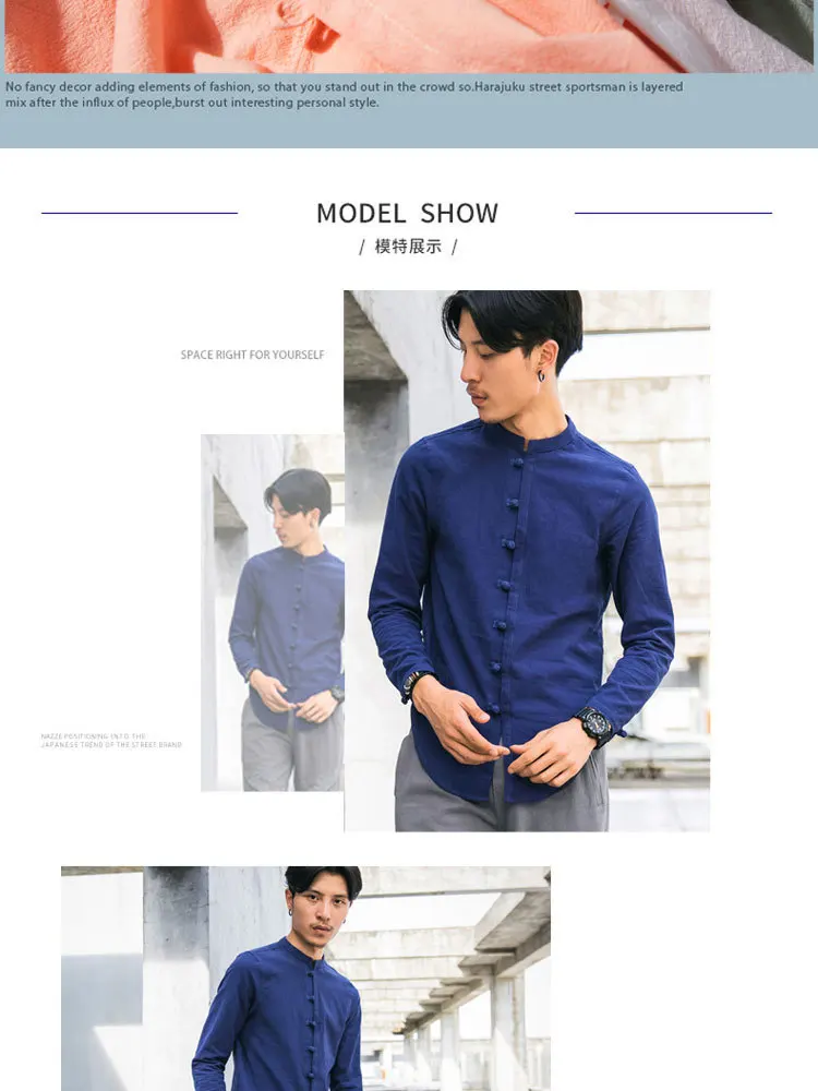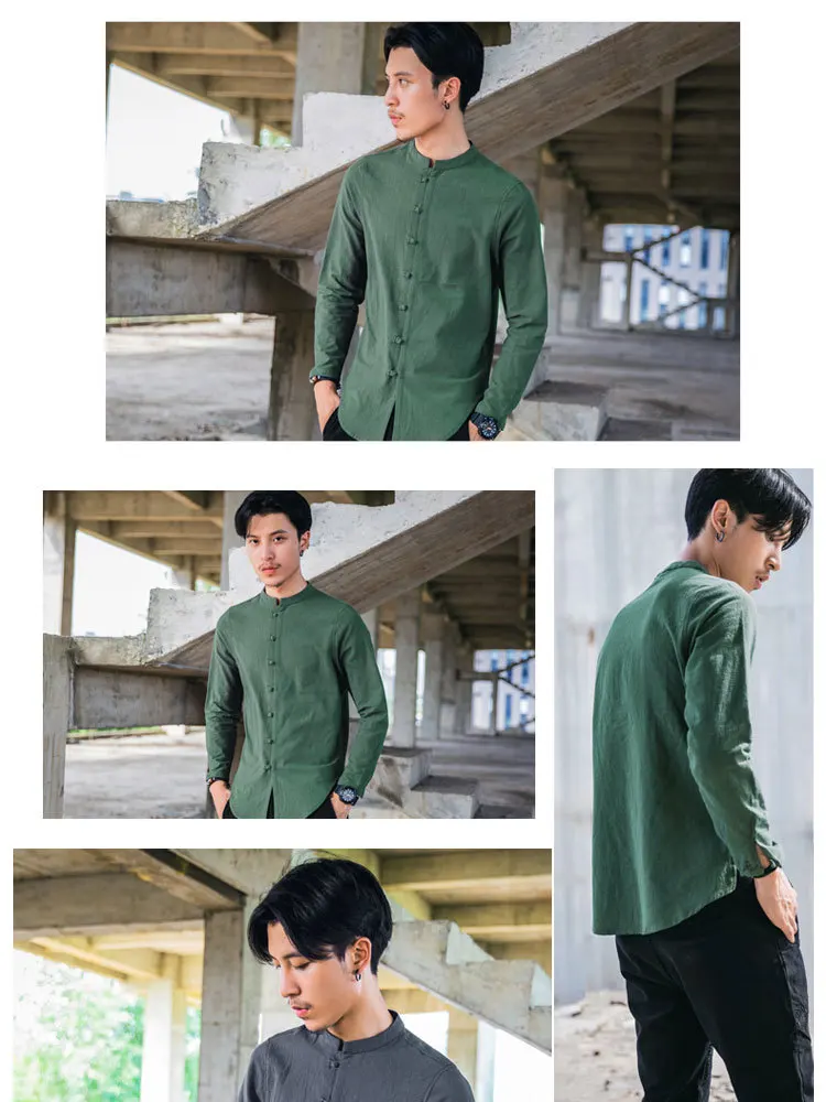 #4711 Весенняя рубашка в китайском стиле с воротником-стойкой, Мужская винтажная Повседневная рубашка большого размера из хлопка и льна с длинным рукавом, мужская приталенная рубашка