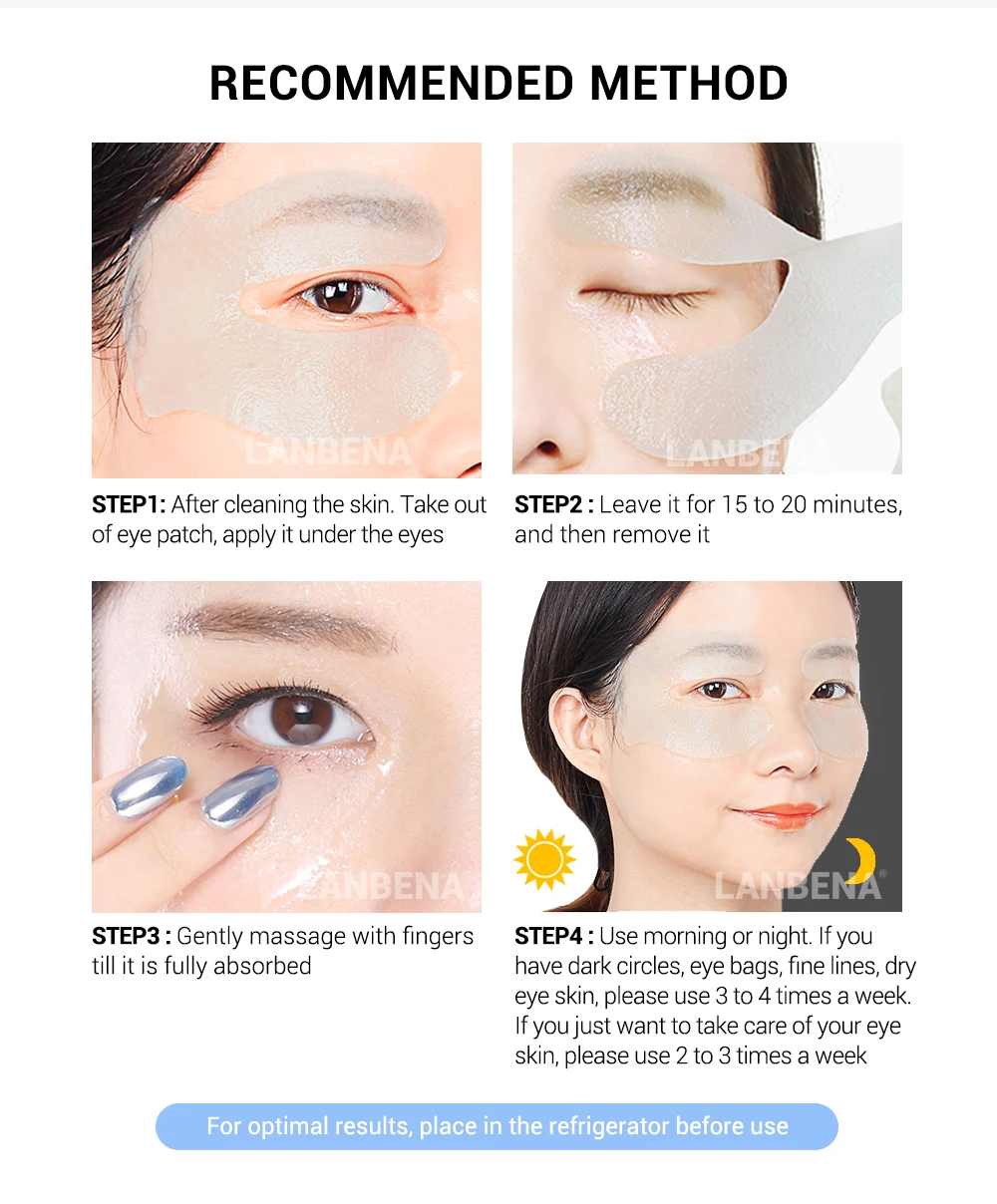 После очищения лица Возьмите маску для глаз специальным пинцетом и нанесите ее на кожу вокруг глаз в течение 15-20 минут, прежде чем промыть лицо водой. Люди с сухой кожей, темными кругами, мешочками для глаз или гусиными лапами должны использовать их 5-7 раз в неделю; В противном случае, обычно его следует использовать 3-4 раза в неделю в рамках режима ухода за кожей. (Для оптимальных результатов поместите в холодильник перед использованием.)