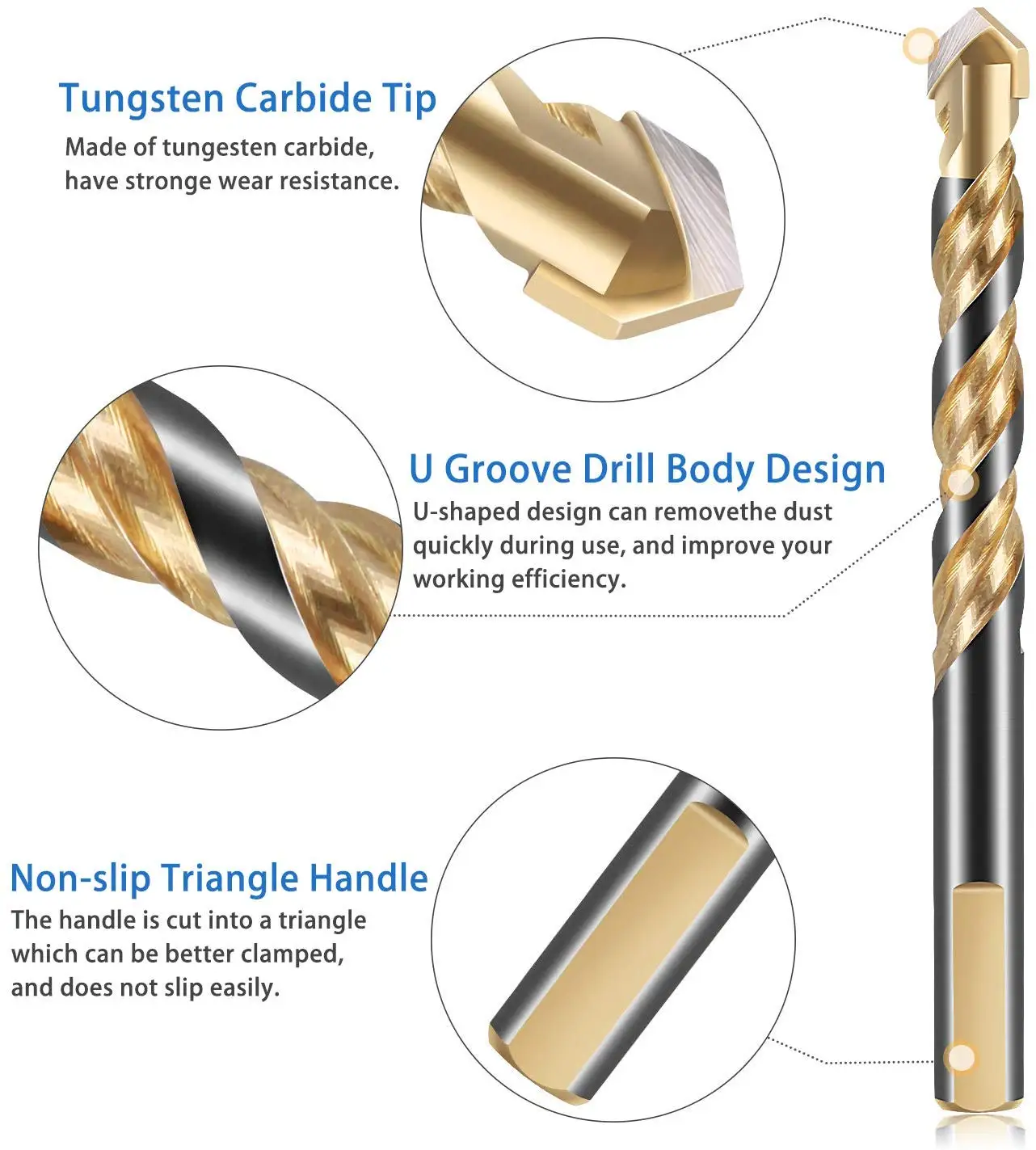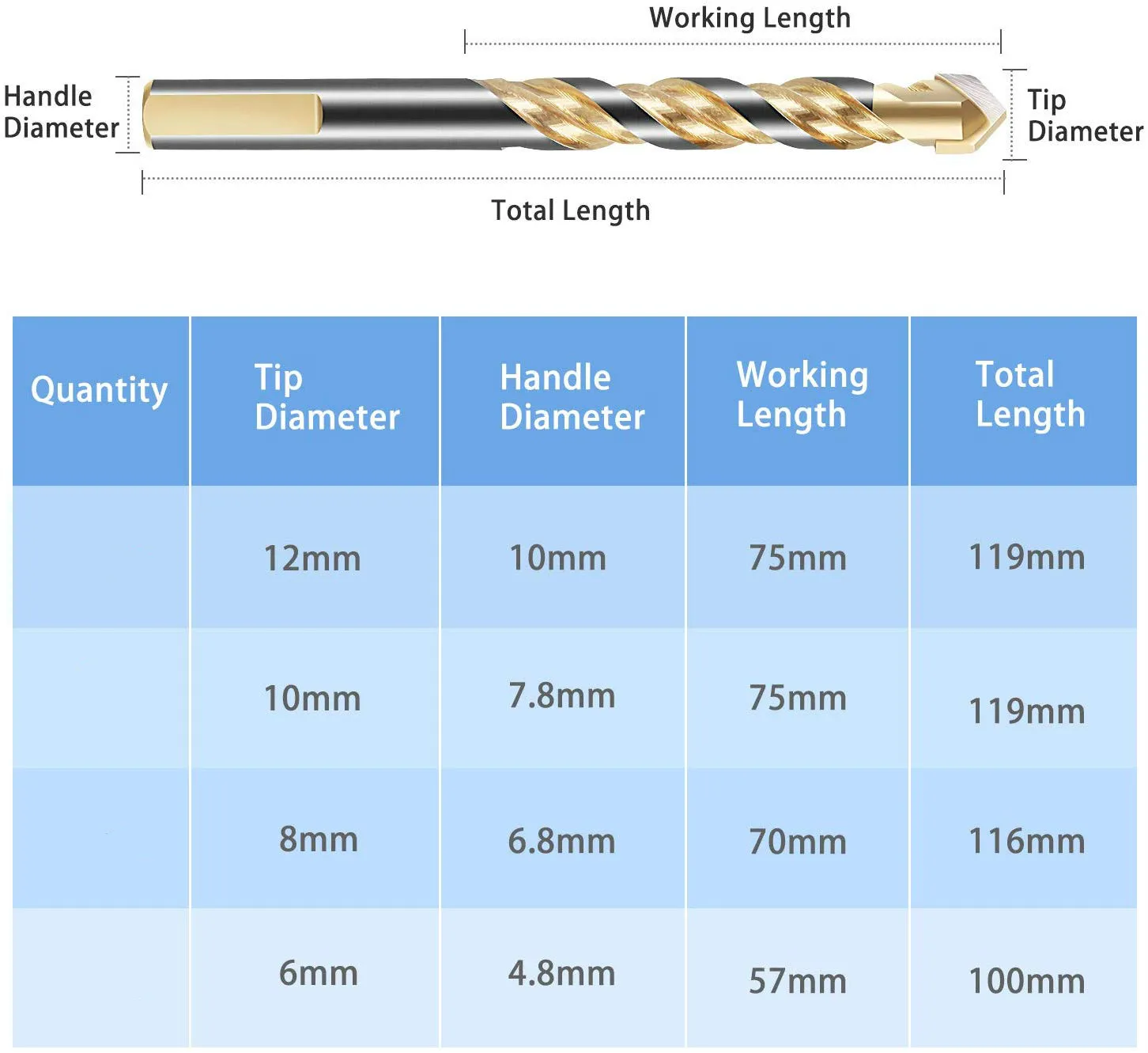 Сверло для фарфоровой керамической плитки, стекла, зеркал, пластика, дерева, сверла для отверстий (6/8/10/12 мм) (Glod) Спецификация:Материал: треугольный сплавВал: 3-плоский валРазмер: 4x6 мм, 8 мм, 10 мм, 12 мм (1/4 ", 1/4", 1/4 ", 1/4", 5/16 ", 3/8", 1/2 ") Внимание:-Держите сверло и долото в вертикальной степени и используйте воду или охлаждающую жидкость во время бурения. -Не выбирайте режим удара сверл или молотков при использовании этих сверл для кладки.-Скорость бурения не должна быть такой быстрой, выберите медленную скорость в начале бурения.