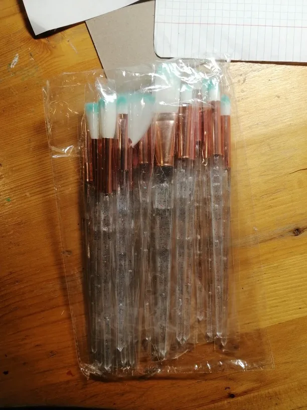 Все кисточки в индивидуальной упаковке, что очень круто. Приятные на ощупь, не пахнут пластмассой (часто натыкалась на откровенно вонючие кисточки, ужас), есть парочка торчащих ворсинок, но это абсолютно не мешает. Я заказывала несколько разных товаров у разных продавцов, в итоге их объединили в один и всё это добро приехало за 7 дней, чему я была безумно рада, т.к. обычно жду 1,5-2 месяца