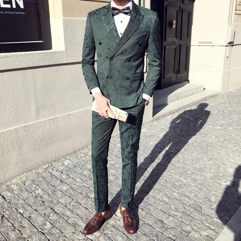 Цветочный узор жаккардовый костюм Для мужчин 2019 Slim Fit 3 предмета Для мужчин s двубортный костюм цвет: черный, синий зеленый выпускного вечера свадебные вечерние костюмы Q534