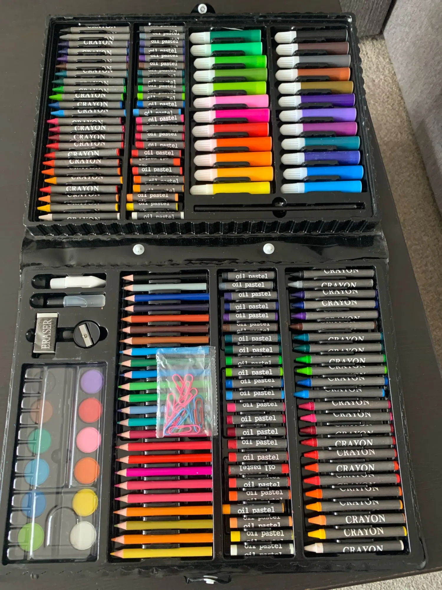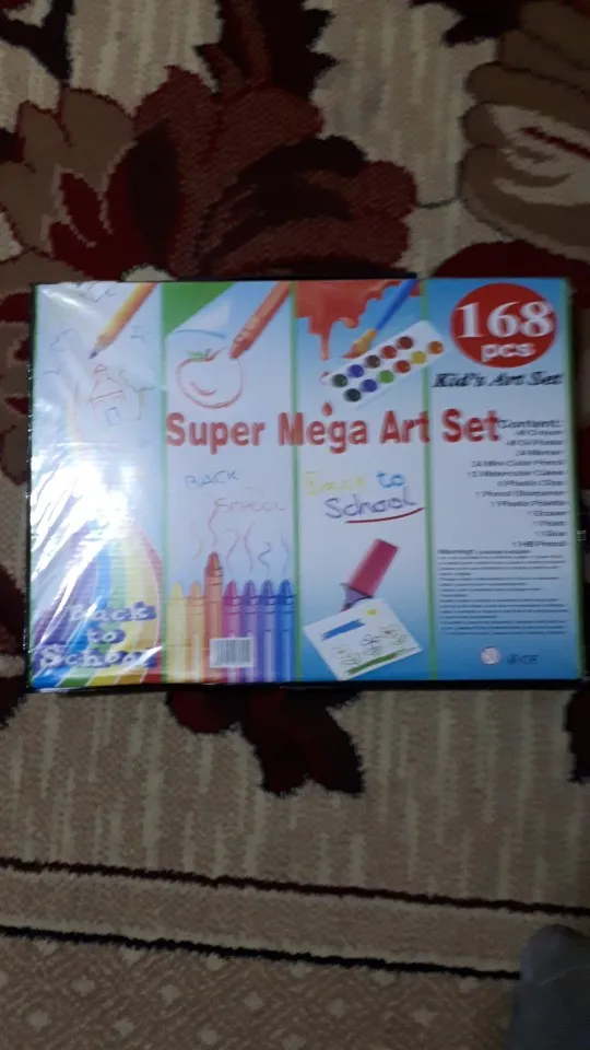 Шло долго, коробка немного помялась но внутри все цело, жуткий запах химии за полдня на открытом воздухе на половину выветрился думаю завтра вонять перестанет. Вроде все пишет все рисует(засохших нет). Сам портфельчик как подложка у конфет в коробках очень хрупкая думаю на надолго ее хватит. В целом за такую цену пойдет, думаю на два три месяца активного рисования ребенку хватит, ну трехкомнатную квартиру точно всю разрисует)