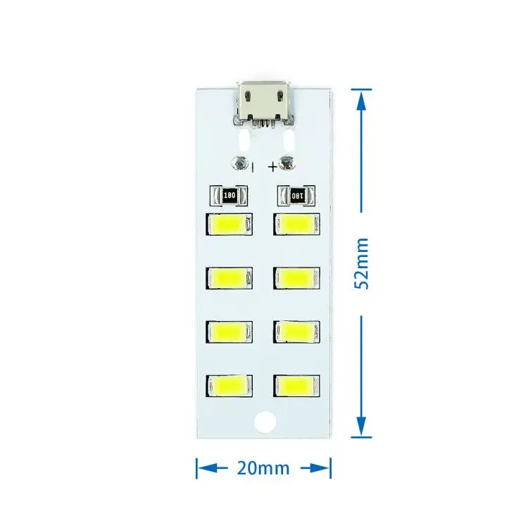 Лампа изготовлена из высококачественных бусин, алюминиевой подложки и микро-usb для интерфейса источника питания. Удобно получить доступ к обычному зарядному устройству мобильного телефона и мобильному источнику питания. Установленный рабочий ток относительно большой, текущее значение 430 мА ~ 470 мА, которое может обеспечить достаточную яркость и имеет лучшую конструкцию рассеивания тепла, чтобы температура не была слишком высокой. Соответствующий резистор с ограничением тока принимает 1210 больших упаковок, Необычные Светодиодные ночные лампы с одним 0805 малым сопротивлением упаковкам.