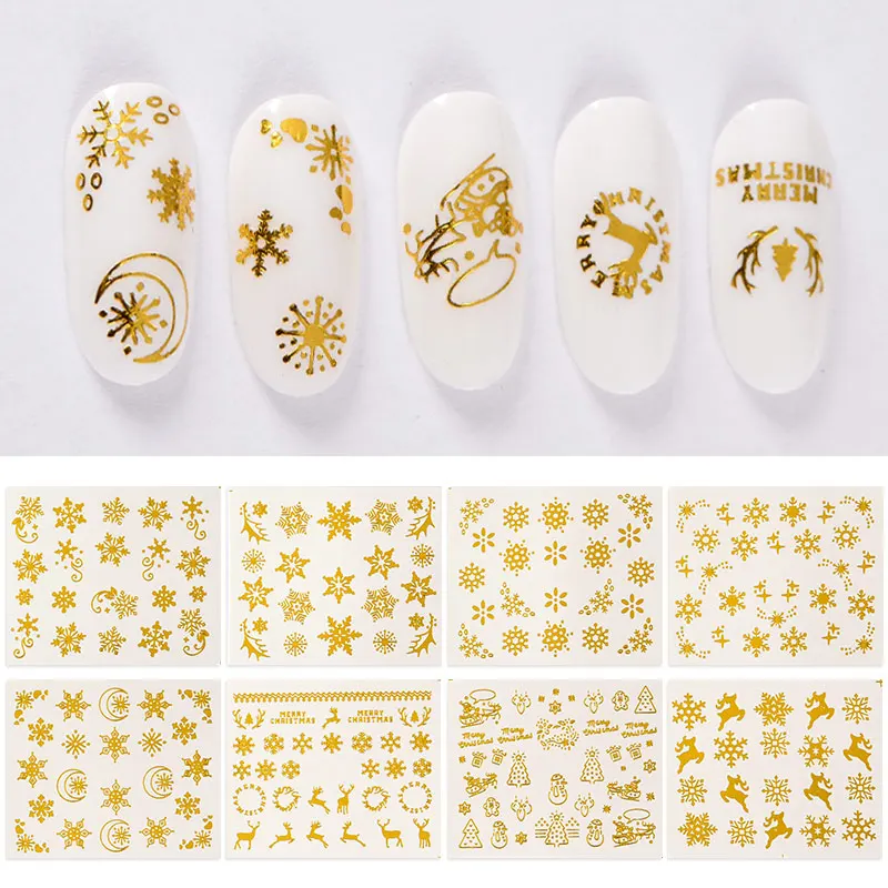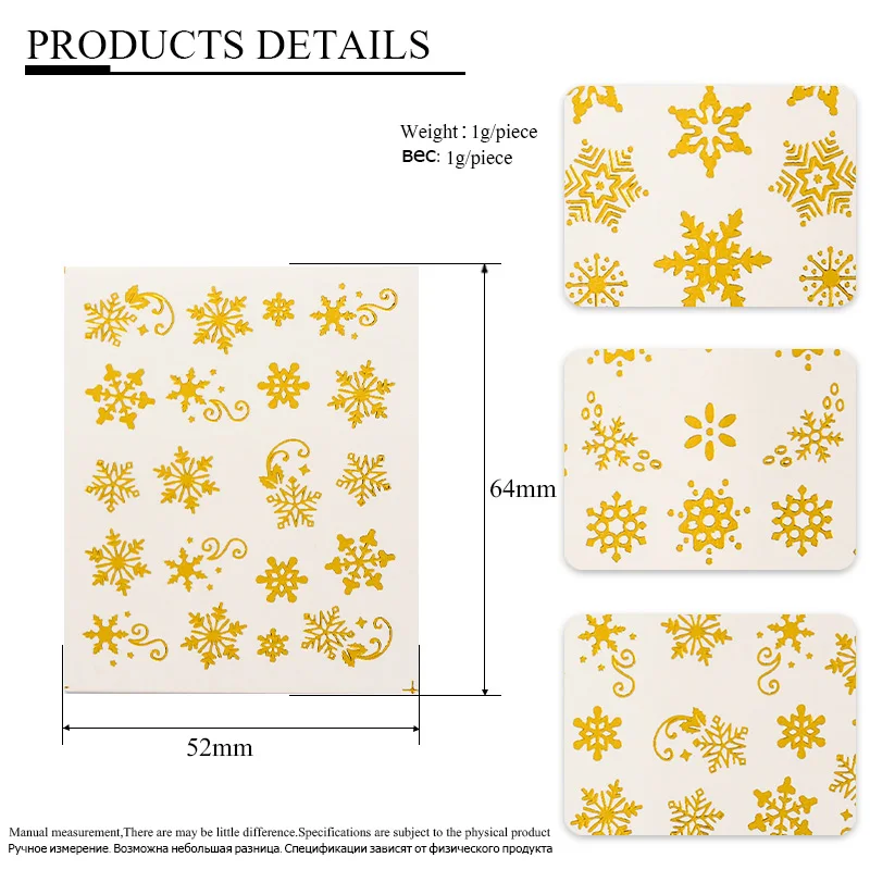 Легко наносится на натуральные или искусственные ногти Параметры: Количество: 1 лист Узор: Снежинка Рождественская елка олень Цвет: Серебряный Золотой блестящий Дизайн: слайдер для переноса воды Размеры: около: 6,3x5,4 см Посылка Содержание: 1 шт. Водные Наклейки для ногтей