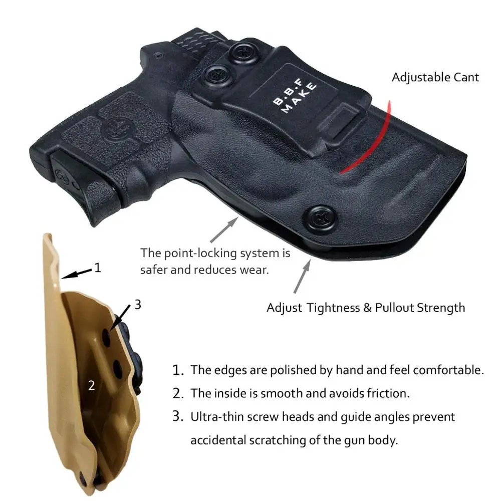 BBF сделать кобура ручной работы изготавливается из прочной 0,8 "KYDEX. Он не только водонепроницаемый, устойчивый к поту, но также обладает высокой прочностью, высокой прочностью, ударопрочностью, износостойкостью и устойчивостью к старению. Может использоваться в различных условиях. Таким образом, вы всегда можете положиться на него, чтобы сохранить свою жизнь.